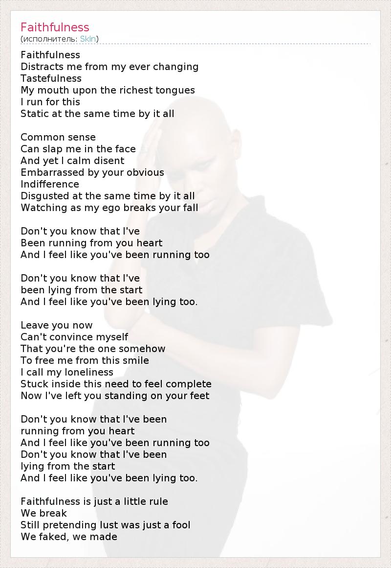 Faithfulness Distracts me from my ever changing Tastefulness My mouth upon the richest tongues I run for this Static at the same time by it all Common sense Can slap me in the face And yet I calm disent Embarrassed by your obvious Indifference Disgusted at the same time by it all Watching as my ego breaks your fall Don't you know that I've Been running from you heart And I feel like you've been running too Don't you know that I've been lying from the start And I feel like you've been lying too. Leave you now Can't convince myself That you're the one somehow To free me from this smile I call my loneliness Stuck inside this need to feel complete Now I've left you standing on your feet Don't you know that I've been running from you heart And I feel like you've been running too Don't you know that I've been lying from the start And I feel like you've been lying too. Faithfulness is just a little rule We break Still pretending lust was just a fool We faked, we made
