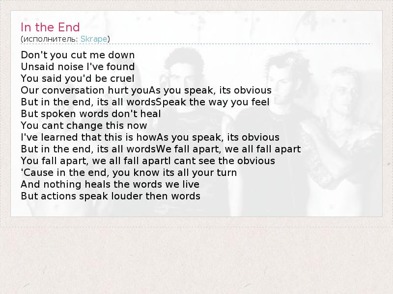 Don't you cut me down Unsaid noise I've found You said you'd be cruel Our conversation hurt youAs you speak, its obvious But in the end, its all wordsSpeak the way you feel But spoken words don't heal You cant change this now I've learned that this is howAs you speak, its obvious But in the end, its all wordsWe fall apart, we all fall apart You fall apart, we all fall apartI cant see the obvious 'Cause in the end, you know its all your turn And nothing heals the words we live But actions speak louder then words