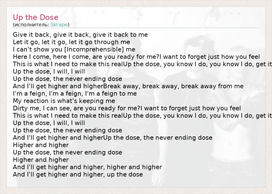Give it back, give it back, give it back to me Let it go, let it go, let it go through me I can't show you [Incomprehensible] me Here I come, here I come, are you ready for me?I want to forget just how you feel This is what I need to make this realUp the dose, you know I do, you know I do, get it Up the dose, I will, I will Up the dose, the never ending dose And I'll get higher and higherBreak away, break away, break away from me I'm a feign, I'm a feign, I'm a feign to me My reaction is what's keeping me Dirty me, I can see, are you ready for me?I want to forget just how you feel This is what I need to make this realUp the dose, you know I do, you know I do, get it Up the dose, I will, I will Up the dose, the never ending dose And I'll get higher and higherUp the dose, the never ending dose Higher and higher Up the dose, the never ending dose Higher and higher And I'll get higher and higher, higher and higher And I'll get higher and higher, up the dose