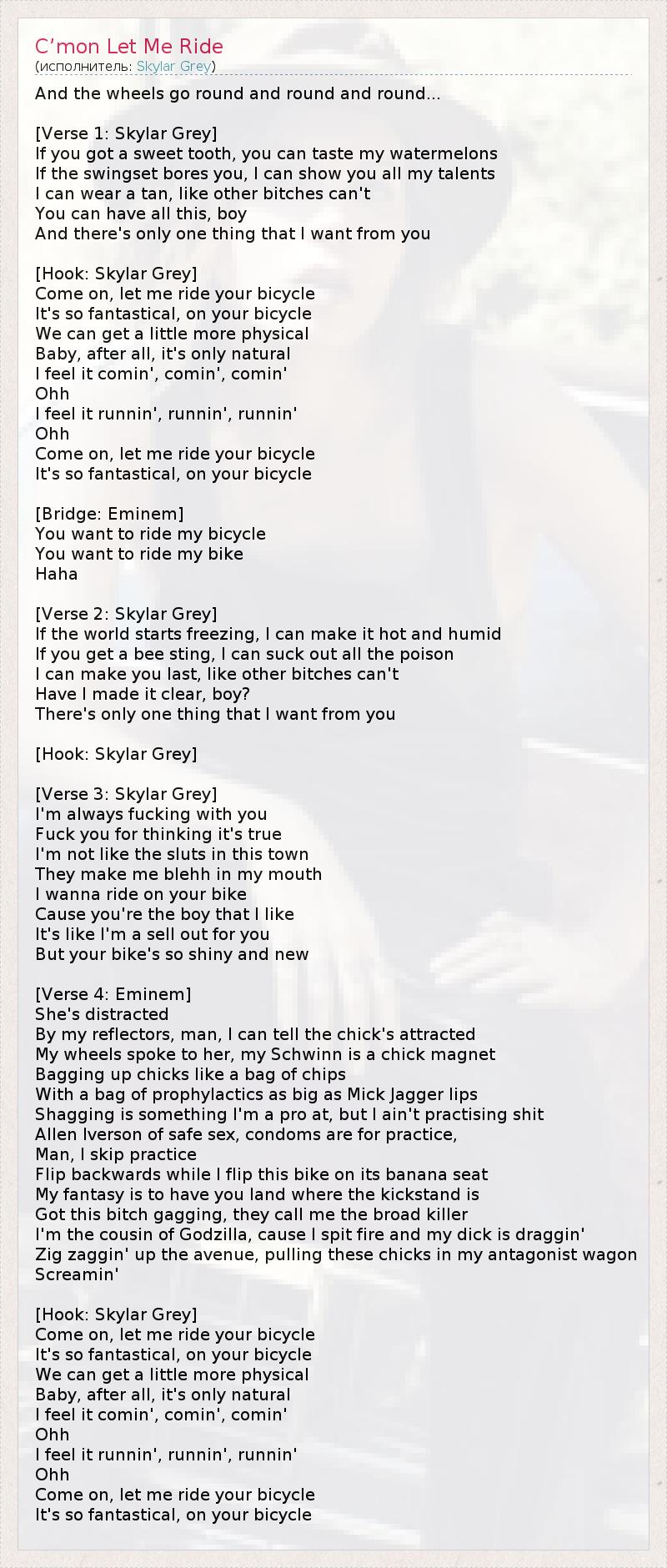 А как ты думаешь, о чем песня "C’mon Let Me Ride" ?