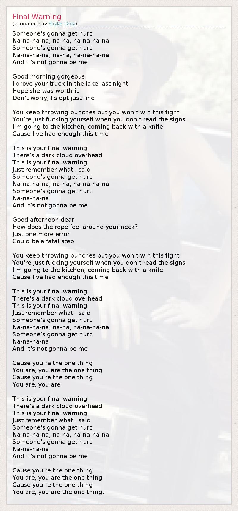 Это интересно:Skylar Grey, настоящее имя — Хо́лли Брук Ха́ферманн (англ. Holly Brook Hafermann; род. 23 февраля 1986 года, Мазомани, штат Висконсин, США) — американская певица, автор песен, музыкальный продюсер, гитаристка и пианистка. Номинантка на премию «Грэмми» (2011).Первые песни, автором которых является новая восходящая звезда Скайлар Грей на весь 2010 год поместились на первых... продолжение