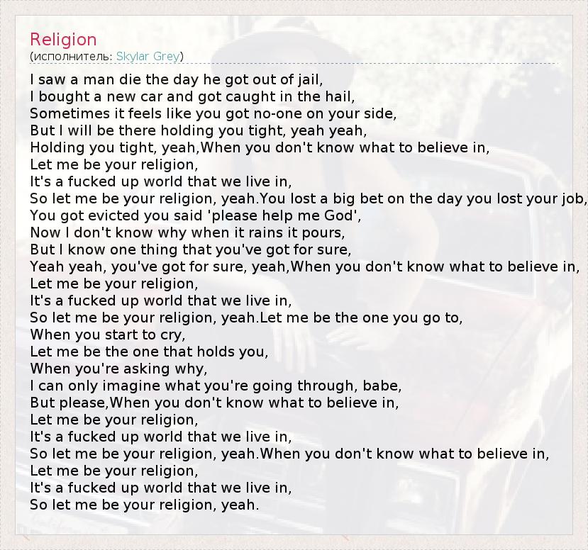 So let me be your religion, yeah.You lost a big bet on the day you lost your job,