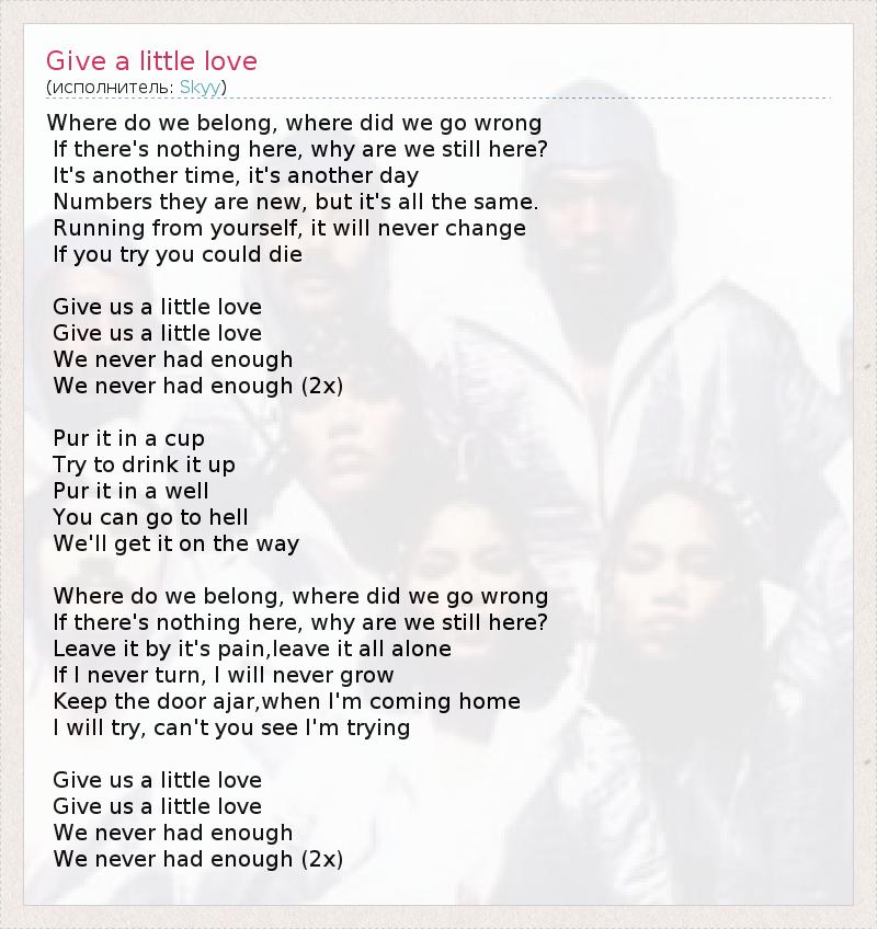 Источник: http://www.amalgama-lab.com/songs/f/fallulah/give_us_a_little_love.html#ixzz2PIcih6gm