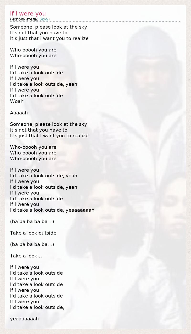 Someone, please look at the sky It's not that you have to It's just that I want you to realize Who-ooooh you are Who-ooooh you are If I were you I'd take a look outside If I were you I'd take a look outside, yeah If I were you I'd take a look outside Woah Aaaaah Someone, please look at the sky It's not that you have to It's just that I want you to realize Who-ooooh you are Who-ooooh you are Who-ooooh you are If I were you I'd take a look outside, yeah If I were you I'd take a look outside, yeah If I were you I'd take a look outside If I were you I'd take a look outside, yeaaaaaaah (ba ba ba ba ba…) Take a look outside (ba ba ba ba ba…) Take a look… If I were you I'd take a look outside If I were you I'd take a look outside If I were you I'd take a look outside If I were you I'd take a look outside, yeaaaaaaah