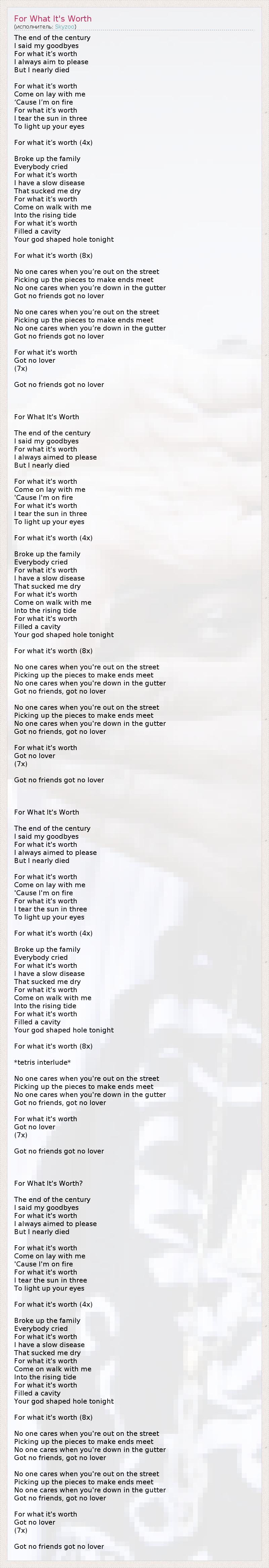 The end of the century I said my goodbyes For what it’s worth I always aim to please But I nearly died For what it’s worth Come on lay with me ‘Cause I’m on fire For what it’s worth I tear the sun in three To light up your eyes For what it’s worth (4x) Broke up the family Everybody cried For what it’s worth I have a slow disease That sucked me dry For what it’s worth Come on walk with me Into the rising tide For what it’s worth Filled a cavity Your god shaped hole tonight For what it’s worth (8x) No one cares when you’re out on the street Picking up the pieces to make ends meet No one cares when you’re down in the gutter Got no friends got no lover No one cares when you’re out on the street Picking up the pieces to make ends meet No one cares when you’re down in the gutter Got no friends got no lover For what it's worth Got no lover (7x) Got no friends got no lover For What It's Worth The end of the century I said my goodbyes For what it's worth I always aimed to please But I nearly died For what it's worth Come on lay with me 'Cause I'm on fire For what it's worth I tear the sun in three To light up your eyes For what it's worth (4x) Broke up the family Everybody cried For what it's worth I have a slow disease That sucked me dry For what it's worth Come on walk with me Into the rising tide For what it's worth Filled a cavity Your god shaped hole tonight For what it's worth (8x) No one cares when you're out on the street Picking up the pieces to make ends meet No one cares when you're down in the gutter Got no friends, got no lover No one cares when you're out on the street Picking up the pieces to make ends meet No one cares when you're down in the gutter Got no friends, got no lover For what it's worth Got no lover (7x) Got no friends got no lover For What It's Worth The end of the century I said my goodbyes For what it's worth I always aimed to please But I nearly died For what it's worth Come on lay with me 'Cause I'm on fire For what it's worth I tear the sun in three To light up your eyes For what it's worth (4x) Broke up the family Everybody cried For what it's worth I have a slow disease That sucked me dry For what it's worth Come on walk with me Into the rising tide For what it's worth Filled a cavity Your god shaped hole tonight For what it's worth (8x) *tetris interlude* No one cares when you're out on the street Picking up the pieces to make ends meet No one cares when you're down in the gutter Got no friends, got no lover For what it's worth Got no lover (7x) Got no friends got no lover For What It's Worth? The end of the century I said my goodbyes For what it's worth I always aimed to please But I nearly died For what it's worth Come on lay with me 'Cause I'm on fire For what it's worth I tear the sun in three To light up your eyes For what it's worth (4x) Broke up the family Everybody cried For what it's worth I have a slow disease That sucked me dry For what it's worth Come on walk with me Into the rising tide For what it's worth Filled a cavity Your god shaped hole tonight For what it's worth (8x) No one cares when you're out on the street Picking up the pieces to make ends meet No one cares when you're down in the gutter Got no friends, got no lover No one cares when you're out on the street Picking up the pieces to make ends meet No one cares when you're down in the gutter Got no friends, got no lover For what it's worth Got no lover (7x) Got no friends got no lover