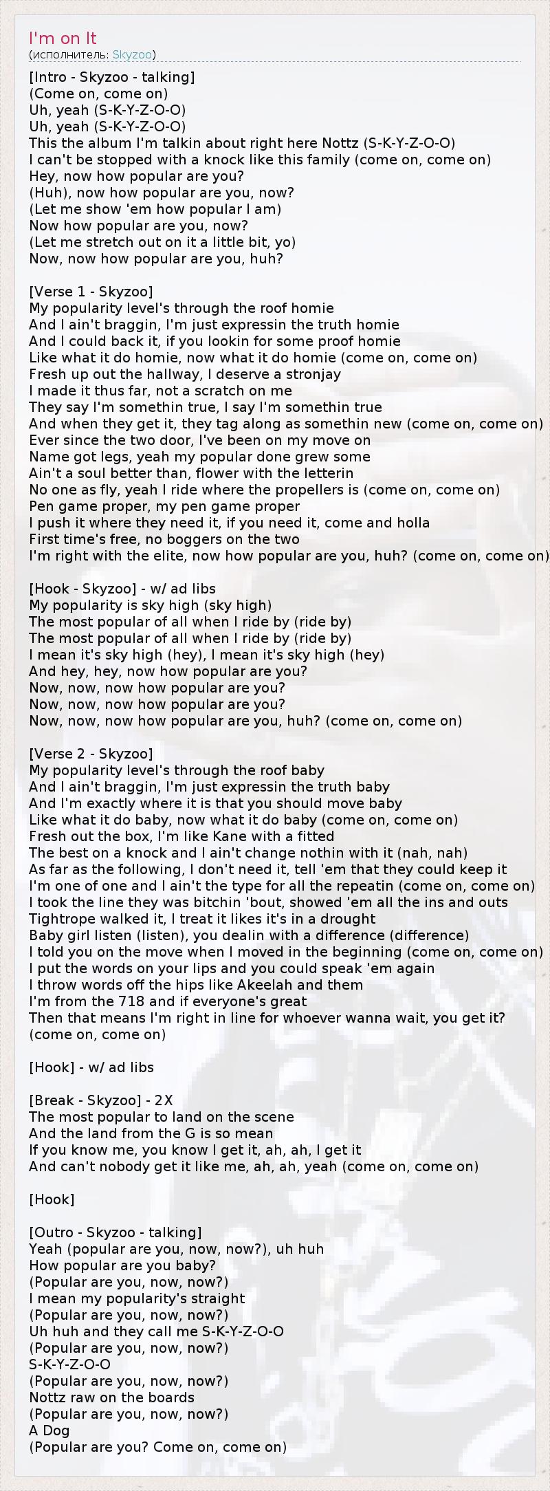 [Intro - Skyzoo - talking] (Come on, come on) Uh, yeah (S-K-Y-Z-O-O) Uh, yeah (S-K-Y-Z-O-O) This the album I'm talkin about right here Nottz (S-K-Y-Z-O-O) I can't be stopped with a knock like this family (come on, come on) Hey, now how popular are you? (Huh), now how popular are you, now? (Let me show 'em how popular I am) Now how popular are you, now? (Let me stretch out on it a little bit, yo) Now, now how popular are you, huh? [Verse 1 - Skyzoo] My popularity level's through the roof homie And I ain't braggin, I'm just expressin the truth homie And I could back it, if you lookin for some proof homie Like what it do homie, now what it do homie (come on, come on) Fresh up out the hallway, I deserve a stronjay I made it thus far, not a scratch on me They say I'm somethin true, I say I'm somethin true And when they get it, they tag along as somethin new (come on, come on) Ever since the two door, I've been on my move on Name got legs, yeah my popular done grew some Ain't a soul better than, flower with the letterin No one as fly, yeah I ride where the propellers is (come on, come on) Pen game proper, my pen game proper I push it where they need it, if you need it, come and holla First time's free, no boggers on the two I'm right with the elite, now how popular are you, huh? (come on, come on) [Hook - Skyzoo] - w/ ad libs My popularity is sky high (sky high) The most popular of all when I ride by (ride by) The most popular of all when I ride by (ride by) I mean it's sky high (hey), I mean it's sky high (hey) And hey, hey, now how popular are you? Now, now, now how popular are you? Now, now, now how popular are you? Now, now, now how popular are you, huh? (come on, come on) [Verse 2 - Skyzoo] My popularity level's through the roof baby And I ain't braggin, I'm just expressin the truth baby And I'm exactly where it is that you should move baby Like what it do baby, now what it do baby (come on, come on) Fresh out the box, I'm like Kane with a fitted The best on a knock and I ain't change nothin with it (nah, nah) As far as the following, I don't need it, tell 'em that they could keep it I'm one of one and I ain't the type for all the repeatin (come on, come on) I took the line they was bitchin 'bout, showed 'em all the ins and outs Tightrope walked it, I treat it likes it's in a drought Baby girl listen (listen), you dealin with a difference (difference) I told you on the move when I moved in the beginning (come on, come on) I put the words on your lips and you could speak 'em again I throw words off the hips like Akeelah and them I'm from the 718 and if everyone's great Then that means I'm right in line for whoever wanna wait, you get it? (come on, come on) [Hook] - w/ ad libs [Break - Skyzoo] - 2X The most popular to land on the scene And the land from the G is so mean If you know me, you know I get it, ah, ah, I get it And can't nobody get it like me, ah, ah, yeah (come on, come on) [Hook] [Outro - Skyzoo - talking] Yeah (popular are you, now, now?), uh huh How popular are you baby? (Popular are you, now, now?) I mean my popularity's straight (Popular are you, now, now?) Uh huh and they call me S-K-Y-Z-O-O (Popular are you, now, now?) S-K-Y-Z-O-O (Popular are you, now, now?) Nottz raw on the boards (Popular are you, now, now?) A Dog (Popular are you? Come on, come on)
