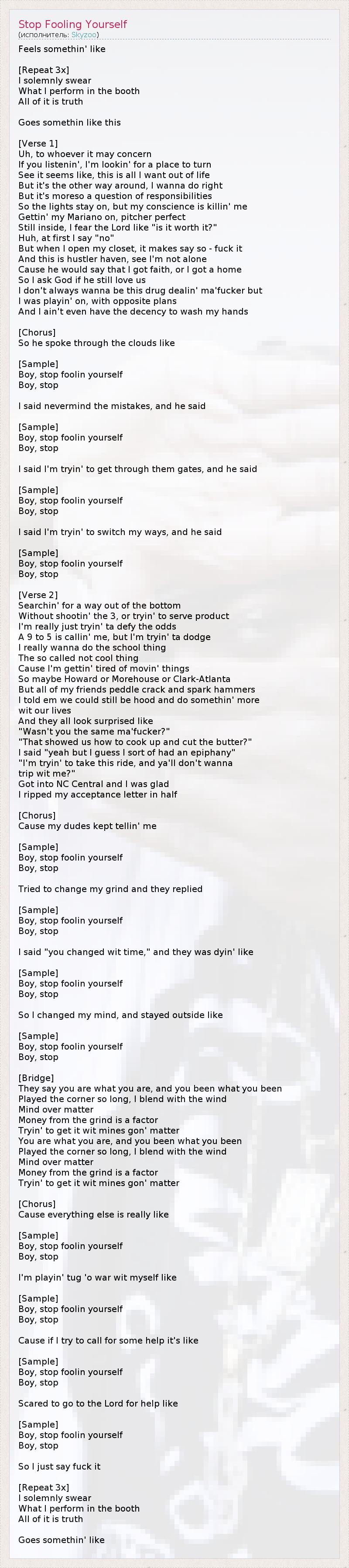 Feels somethin' like [Repeat 3x] I solemnly swear What I perform in the booth All of it is truth Goes somethin like this [Verse 1] Uh, to whoever it may concern If you listenin', I'm lookin' for a place to turn See it seems like, this is all I want out of life But it's the other way around, I wanna do right But it's moreso a question of responsibilities So the lights stay on, but my conscience is killin' me Gettin' my Mariano on, pitcher perfect Still inside, I fear the Lord like "is it worth it?" Huh, at first I say "no" But when I open my closet, it makes say so - fuck it And this is hustler haven, see I'm not alone Cause he would say that I got faith, or I got a home So I ask God if he still love us I don't always wanna be this drug dealin' ma'fucker but I was playin' on, with opposite plans And I ain't even have the decency to wash my hands [Chorus] So he spoke through the clouds like [Sample] Boy, stop foolin yourself Boy, stop I said nevermind the mistakes, and he said [Sample] Boy, stop foolin yourself Boy, stop I said I'm tryin' to get through them gates, and he said [Sample] Boy, stop foolin yourself Boy, stop I said I'm tryin' to switch my ways, and he said [Sample] Boy, stop foolin yourself Boy, stop [Verse 2] Searchin' for a way out of the bottom Without shootin' the 3, or tryin' to serve product I'm really just tryin' ta defy the odds A 9 to 5 is callin' me, but I'm tryin' ta dodge I really wanna do the school thing The so called not cool thing Cause I'm gettin' tired of movin' things So maybe Howard or Morehouse or Clark-Atlanta But all of my friends peddle crack and spark hammers I told em we could still be hood and do somethin' more wit our lives And they all look surprised like "Wasn't you the same ma'fucker?" "That showed us how to cook up and cut the butter?" I said "yeah but I guess I sort of had an epiphany" "I'm tryin' to take this ride, and ya'll don't wanna trip wit me?" Got into NC Central and I was glad I ripped my acceptance letter in half [Chorus] Cause my dudes kept tellin' me [Sample] Boy, stop foolin yourself Boy, stop Tried to change my grind and they replied [Sample] Boy, stop foolin yourself Boy, stop I said "you changed wit time," and they was dyin' like [Sample] Boy, stop foolin yourself Boy, stop So I changed my mind, and stayed outside like [Sample] Boy, stop foolin yourself Boy, stop [Bridge] They say you are what you are, and you been what you been Played the corner so long, I blend with the wind Mind over matter Money from the grind is a factor Tryin' to get it wit mines gon' matter You are what you are, and you been what you been Played the corner so long, I blend with the wind Mind over matter Money from the grind is a factor Tryin' to get it wit mines gon' matter [Chorus] Cause everything else is really like [Sample] Boy, stop foolin yourself Boy, stop I'm playin' tug 'o war wit myself like [Sample] Boy, stop foolin yourself Boy, stop Cause if I try to call for some help it's like [Sample] Boy, stop foolin yourself Boy, stop Scared to go to the Lord for help like [Sample] Boy, stop foolin yourself Boy, stop So I just say fuck it [Repeat 3x] I solemnly swear What I perform in the booth All of it is truth Goes somethin' like