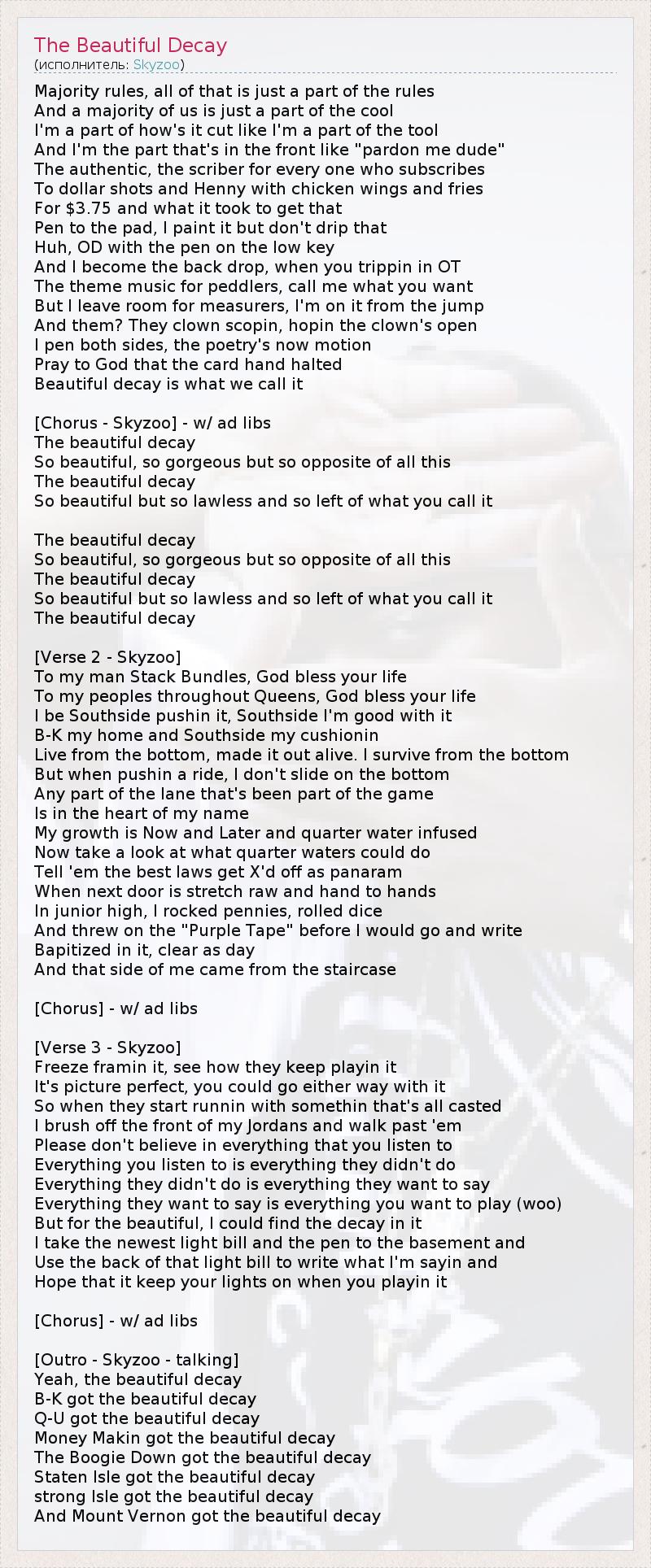 Majority rules, all of that is just a part of the rules And a majority of us is just a part of the cool I'm a part of how's it cut like I'm a part of the tool And I'm the part that's in the front like "pardon me dude" The authentic, the scriber for every one who subscribes To dollar shots and Henny with chicken wings and fries For $3.75 and what it took to get that Pen to the pad, I paint it but don't drip that Huh, OD with the pen on the low key And I become the back drop, when you trippin in OT The theme music for peddlers, call me what you want But I leave room for measurers, I'm on it from the jump And them? They clown scopin, hopin the clown's open I pen both sides, the poetry's now motion Pray to God that the card hand halted Beautiful decay is what we call it [Chorus - Skyzoo] - w/ ad libs The beautiful decay So beautiful, so gorgeous but so opposite of all this The beautiful decay So beautiful but so lawless and so left of what you call it The beautiful decay So beautiful, so gorgeous but so opposite of all this The beautiful decay So beautiful but so lawless and so left of what you call it The beautiful decay [Verse 2 - Skyzoo] To my man Stack Bundles, God bless your life To my peoples throughout Queens, God bless your life I be Southside pushin it, Southside I'm good with it B-K my home and Southside my cushionin Live from the bottom, made it out alive. I survive from the bottom But when pushin a ride, I don't slide on the bottom Any part of the lane that's been part of the game Is in the heart of my name My growth is Now and Later and quarter water infused Now take a look at what quarter waters could do Tell 'em the best laws get X'd off as panaram When next door is stretch raw and hand to hands In junior high, I rocked pennies, rolled dice And threw on the "Purple Tape" before I would go and write Bapitized in it, clear as day And that side of me came from the staircase [Chorus] - w/ ad libs [Verse 3 - Skyzoo] Freeze framin it, see how they keep playin it It's picture perfect, you could go either way with it So when they start runnin with somethin that's all casted I brush off the front of my Jordans and walk past 'em Please don't believe in everything that you listen to Everything you listen to is everything they didn't do Everything they didn't do is everything they want to say Everything they want to say is everything you want to play (woo) But for the beautiful, I could find the decay in it I take the newest light bill and the pen to the basement and Use the back of that light bill to write what I'm sayin and Hope that it keep your lights on when you playin it [Chorus] - w/ ad libs [Outro - Skyzoo - talking] Yeah, the beautiful decay B-K got the beautiful decay Q-U got the beautiful decay Money Makin got the beautiful decay The Boogie Down got the beautiful decay Staten Isle got the beautiful decay strong Isle got the beautiful decay And Mount Vernon got the beautiful decay