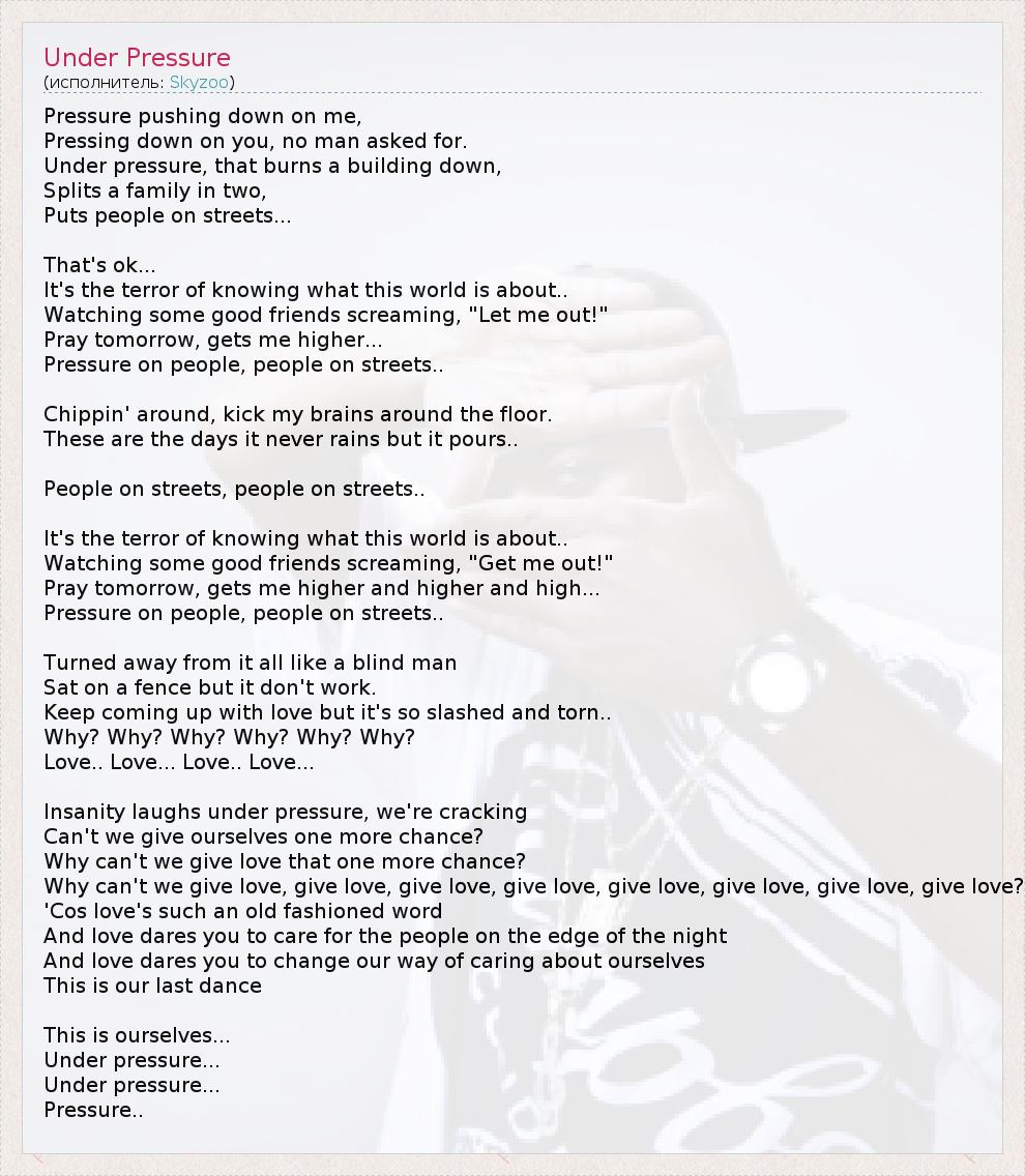 Pressure pushing down on me, Pressing down on you, no man asked for. Under pressure, that burns a building down, Splits a family in two, Puts people on streets... That's ok... It's the terror of knowing what this world is about.. Watching some good friends screaming, "Let me out!" Pray tomorrow, gets me higher... Pressure on people, people on streets.. Chippin' around, kick my brains around the floor. These are the days it never rains but it pours.. People on streets, people on streets.. It's the terror of knowing what this world is about.. Watching some good friends screaming, "Get me out!" Pray tomorrow, gets me higher and higher and high... Pressure on people, people on streets.. Turned away from it all like a blind man Sat on a fence but it don't work. Keep coming up with love but it's so slashed and torn.. Why? Why? Why? Why? Why? Why? Love.. Love... Love.. Love... Insanity laughs under pressure, we're cracking Can't we give ourselves one more chance? Why can't we give love that one more chance? Why can't we give love, give love, give love, give love, give love, give love, give love, give love? 'Cos love's such an old fashioned word And love dares you to care for the people on the edge of the night And love dares you to change our way of caring about ourselves This is our last dance This is ourselves... Under pressure... Under pressure... Pressure..