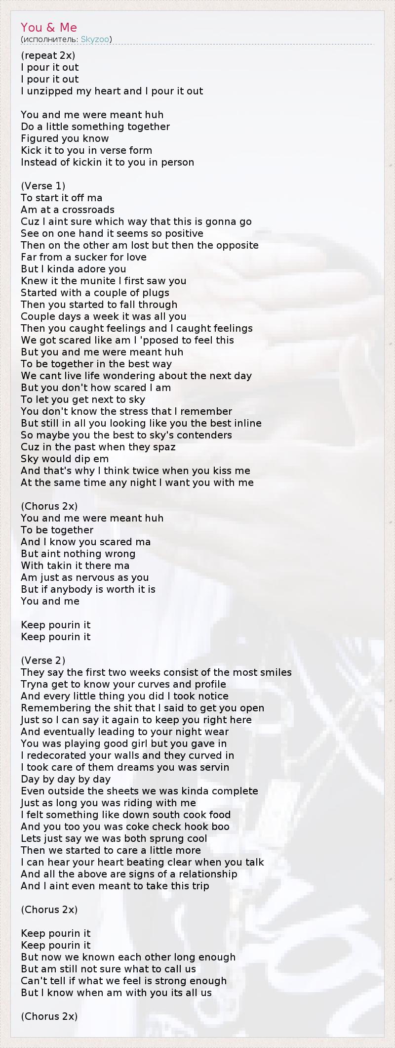(repeat 2x) I pour it out I pour it out I unzipped my heart and I pour it out You and me were meant huh Do a little something together Figured you know Kick it to you in verse form Instead of kickin it to you in person (Verse 1) To start it off ma Am at a crossroads Cuz I aint sure which way that this is gonna go See on one hand it seems so positive Then on the other am lost but then the opposite Far from a sucker for love But I kinda adore you Knew it the munite I first saw you Started with a couple of plugs Then you started to fall through Couple days a week it was all you Then you caught feelings and I caught feelings We got scared like am I 'pposed to feel this But you and me were meant huh To be together in the best way We cant live life wondering about the next day But you don't how scared I am To let you get next to sky You don't know the stress that I remember But still in all you looking like you the best inline So maybe you the best to sky's contenders Cuz in the past when they spaz Sky would dip em And that's why I think twice when you kiss me At the same time any night I want you with me (Chorus 2x) You and me were meant huh To be together And I know you scared ma But aint nothing wrong With takin it there ma Am just as nervous as you But if anybody is worth it is You and me Keep pourin it Keep pourin it (Verse 2) They say the first two weeks consist of the most smiles Tryna get to know your curves and profile And every little thing you did I took notice Remembering the shit that I said to get you open Just so I can say it again to keep you right here And eventually leading to your night wear You was playing good girl but you gave in I redecorated your walls and they curved in I took care of them dreams you was servin Day by day by day Even outside the sheets we was kinda complete Just as long you was riding with me I felt something like down south cook food And you too you was coke check hook boo Lets just say we was both sprung cool Then we started to care a little more I can hear your heart beating clear when you talk And all the above are signs of a relationship And I aint even meant to take this trip (Chorus 2x) Keep pourin it Keep pourin it But now we known each other long enough But am still not sure what to call us Can't tell if what we feel is strong enough But I know when am with you its all us (Chorus 2x)