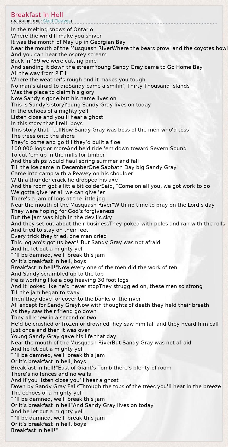 А как ты думаешь, о чем песня "Breakfast In Hell" ?