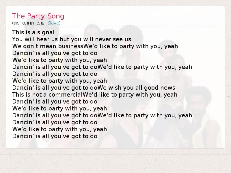 This is a signal You will hear us but you will never see us We don't mean businessWe'd like to party with you, yeah Dancin' is all you've got to do We'd like to party with you, yeah Dancin' is all you've got to doWe'd like to party with you, yeah Dancin' is all you've got to do We'd like to party with you, yeah Dancin' is all you've got to doWe wish you all good news This is not a commercialWe'd like to party with you, yeah Dancin' is all you've got to do We'd like to party with you, yeah Dancin' is all you've got to doWe'd like to party with you, yeah Dancin' is all you've got to do We'd like to party with you, yeah Dancin' is all you've got to do