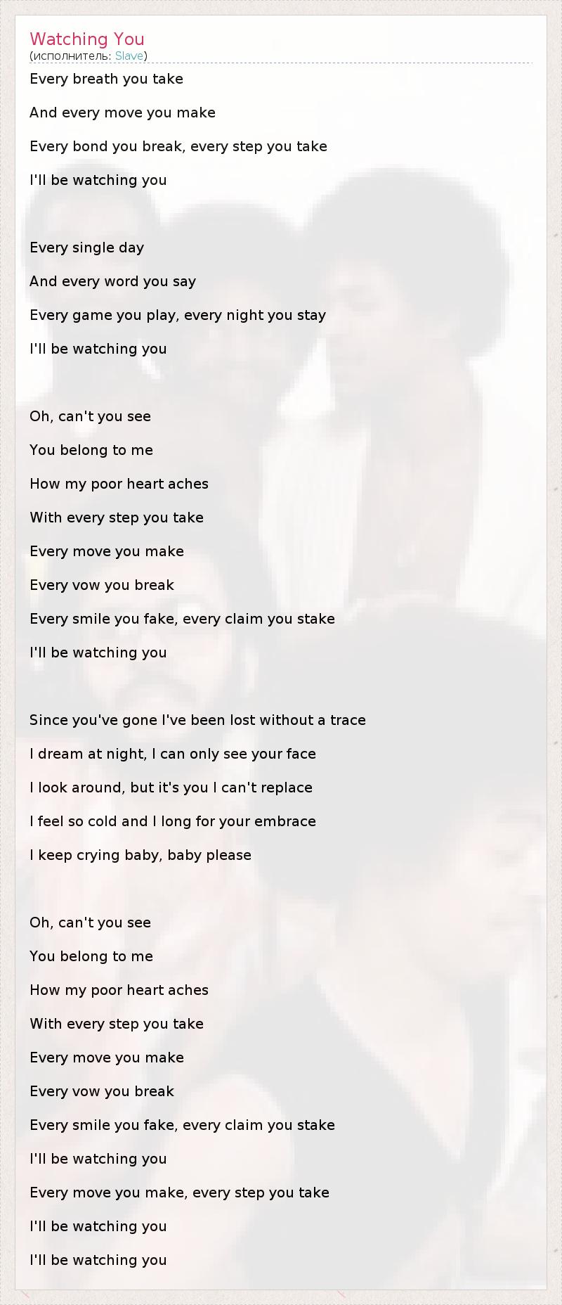 Every breath you take And every move you make Every bond you break, every step you take I'll be watching you Every single day And every word you say Every game you play, every night you stay I'll be watching you Oh, can't you see You belong to me How my poor heart aches With every step you take Every move you make Every vow you break Every smile you fake, every claim you stake I'll be watching you Since you've gone I've been lost without a trace I dream at night, I can only see your face I look around, but it's you I can't replace I feel so cold and I long for your embrace I keep crying baby, baby please Oh, can't you see You belong to me How my poor heart aches With every step you take Every move you make Every vow you break Every smile you fake, every claim you stake I'll be watching you Every move you make, every step you take I'll be watching you I'll be watching you