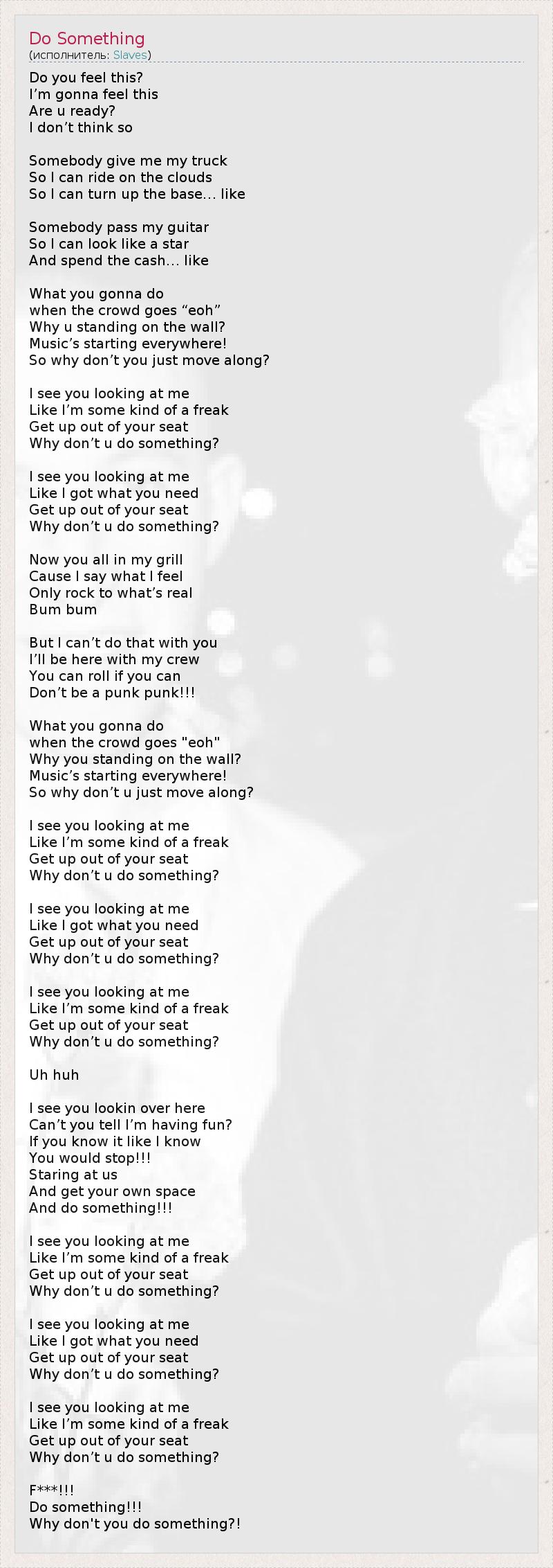 Do you feel this? I’m gonna feel this Are u ready? I don’t think so Somebody give me my truck So I can ride on the clouds So I can turn up the base… like Somebody pass my guitar So I can look like a star And spend the cash… like What you gonna do when the crowd goes “eoh” Why u standing on the wall? Music’s starting everywhere! So why don’t you just move along? I see you looking at me Like I’m some kind of a freak Get up out of your seat Why don’t u do something? I see you looking at me Like I got what you need Get up out of your seat Why don’t u do something? Now you all in my grill Cause I say what I feel Only rock to what’s real Bum bum But I can’t do that with you I’ll be here with my crew You can roll if you can Don’t be a punk punk!!! What you gonna do when the crowd goes "eoh" Why you standing on the wall? Music’s starting everywhere! So why don’t u just move along? I see you looking at me Like I’m some kind of a freak Get up out of your seat Why don’t u do something? I see you looking at me Like I got what you need Get up out of your seat Why don’t u do something? I see you looking at me Like I’m some kind of a freak Get up out of your seat Why don’t u do something? Uh huh I see you lookin over here Can’t you tell I’m having fun? If you know it like I know You would stop!!! Staring at us And get your own space And do something!!! I see you looking at me Like I’m some kind of a freak Get up out of your seat Why don’t u do something? I see you looking at me Like I got what you need Get up out of your seat Why don’t u do something? I see you looking at me Like I’m some kind of a freak Get up out of your seat Why don’t u do something? F***!!! Do something!!! Why don't you do something?!