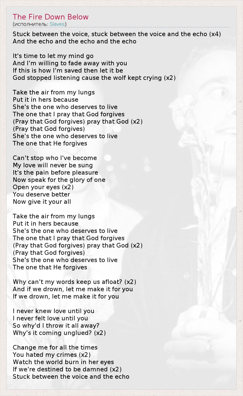 Застрял между голосом, застрял между голосом и эхо (x4) И эхо и эхо и эхо Это время, чтобы мой ум идти И я готов исчезнуть с вами Если это, как я спасен, то пусть это будет Бог перестал слушать причиной волк кричал (x2) Возьмите воздух из моих легких Положите его в свои Потому что Она тот, кто заслуживает того, чтобы жить Тот, который я молюсь, чтобы Бог прощает (Молитесь, чтобы Бог прощает) молиться, чтобы Бог (x2) (Молитесь, чтобы Бог прощает) Она тот, кто заслуживает того, чтобы жить Тот, который он прощает Не удается остановить, которые я стал Моя любовь никогда не будет петь Это боль, прежде чем удовольствия Сейчас много говорят о славе одного Открой глаза (x2) Ты заслуживаешь лучшего Теперь дайте ему все ваши Возьмите воздух из моих легких Положите его в свои Потому что Она тот, кто заслуживает того, чтобы жить Тот, который я молюсь, чтобы Бог прощает (Молитесь, чтобы Бог прощает) молиться, чтобы Бог (x2) (Молитесь, чтобы Бог прощает) Она тот, кто заслуживает того, чтобы жить Тот, который он прощает Почему мои слова не могут держать нас на плаву? (Х2) И если мы тонем, позвольте мне сделать это для вас Если мы тонем, позвольте мне сделать это для вас Я никогда не знал любви, пока вы Я никогда не чувствовал любовь, пока вы Так почему я все выбросить? Почему же это случится слабины? (Х2) Измени меня за все времена Ты ненавидел мои преступления (x2) Смотреть на мир гореть в глазах Если мы обречены быть проклят (x2) Застрял между голосом и эхо