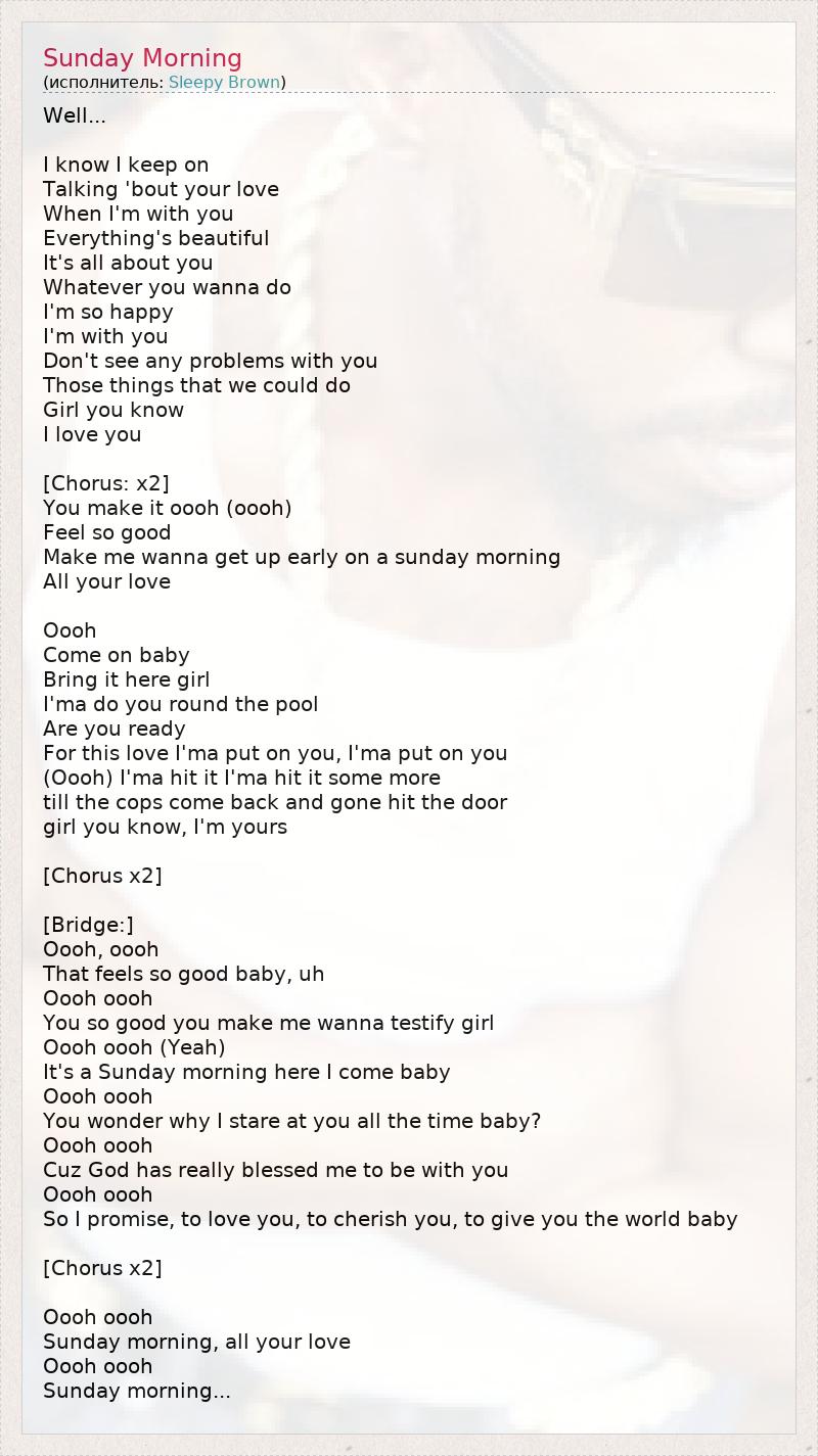 Well... I know I keep on Talking 'bout your love When I'm with you Everything's beautiful It's all about you Whatever you wanna do I'm so happy I'm with you Don't see any problems with you Those things that we could do Girl you know I love you [Chorus: x2] You make it oooh (oooh) Feel so good Make me wanna get up early on a sunday morning All your love Oooh Come on baby Bring it here girl I'ma do you round the pool Are you ready For this love I'ma put on you, I'ma put on you (Oooh) I'ma hit it I'ma hit it some more till the cops come back and gone hit the door girl you know, I'm yours [Chorus x2] [Bridge:] Oooh, oooh That feels so good baby, uh Oooh oooh You so good you make me wanna testify girl Oooh oooh (Yeah) It's a Sunday morning here I come baby Oooh oooh You wonder why I stare at you all the time baby? Oooh oooh Cuz God has really blessed me to be with you Oooh oooh So I promise, to love you, to cherish you, to give you the world baby [Chorus x2] Oooh oooh Sunday morning, all your love Oooh oooh Sunday morning...
