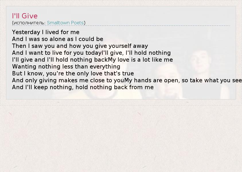 Yesterday I lived for me And I was so alone as I could be Then I saw you and how you give yourself away And I want to live for you todayI'll give, I'll hold nothing I'll give and I'll hold nothing backMy love is a lot like me Wanting nothing less than everything But I know, you're the only love that's true And only giving makes me close to youMy hands are open, so take what you see And I'll keep nothing, hold nothing back from me