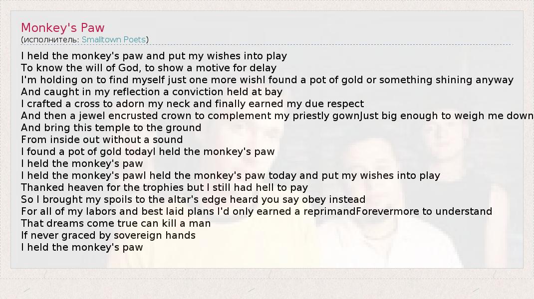 А как ты думаешь, о чем песня "Monkey's Paw" ?