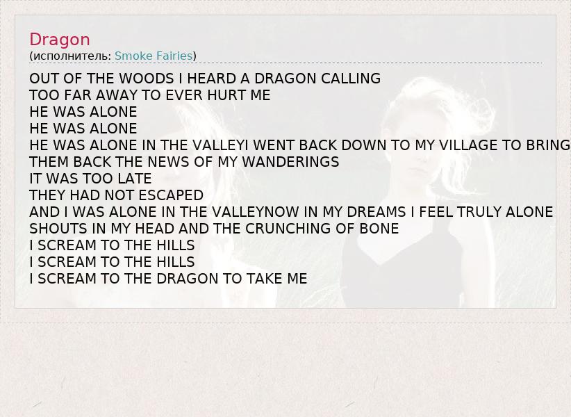 OUT OF THE WOODS I HEARD A DRAGON CALLING TOO FAR AWAY TO EVER HURT ME HE WAS ALONE HE WAS ALONE HE WAS ALONE IN THE VALLEYI WENT BACK DOWN TO MY VILLAGE TO BRING THEM BACK THE NEWS OF MY WANDERINGS IT WAS TOO LATE THEY HAD NOT ESCAPED AND I WAS ALONE IN THE VALLEYNOW IN MY DREAMS I FEEL TRULY ALONE SHOUTS IN MY HEAD AND THE CRUNCHING OF BONE I SCREAM TO THE HILLS I SCREAM TO THE HILLS I SCREAM TO THE DRAGON TO TAKE ME