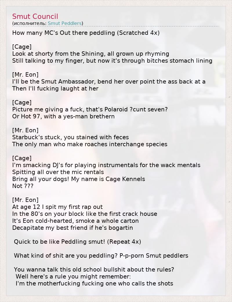 How many MC's Out there peddling (Scratched 4x) [Cage] Look at shorty from the Shining, all grown up rhyming Still talking to my finger, but now it's through bitches stomach lining [Mr. Eon] I'll be the Smut Ambassador, bend her over point the ass back at a Then I'll fucking laught at her [Cage] Picture me giving a fuck, that's Polaroid ?cunt seven? Or Hot 97, with a yes-man brethern [Mr. Eon] Starbuck's stuck, you stained with feces The only man who make roaches interchange species [Cage] I'm smacking DJ's for playing instrumentals for the wack mentals Spitting all over the mic rentals Bring all your dogs! My name is Cage Kennels Not ??? [Mr. Eon] At age 12 I spit my first rap out In the 80's on your block like the first crack house It's Eon cold-hearted, smoke a whole carton Decapitate my best friend if he's bogartin Quick to be like Peddling smut! (Repeat 4x) What kind of shit are you peddling? P-p-porn Smut peddlers You wanna talk this old school bullshit about the rules? Well here's a rule you might remember: I'm the motherfucking fucking one who calls the shots