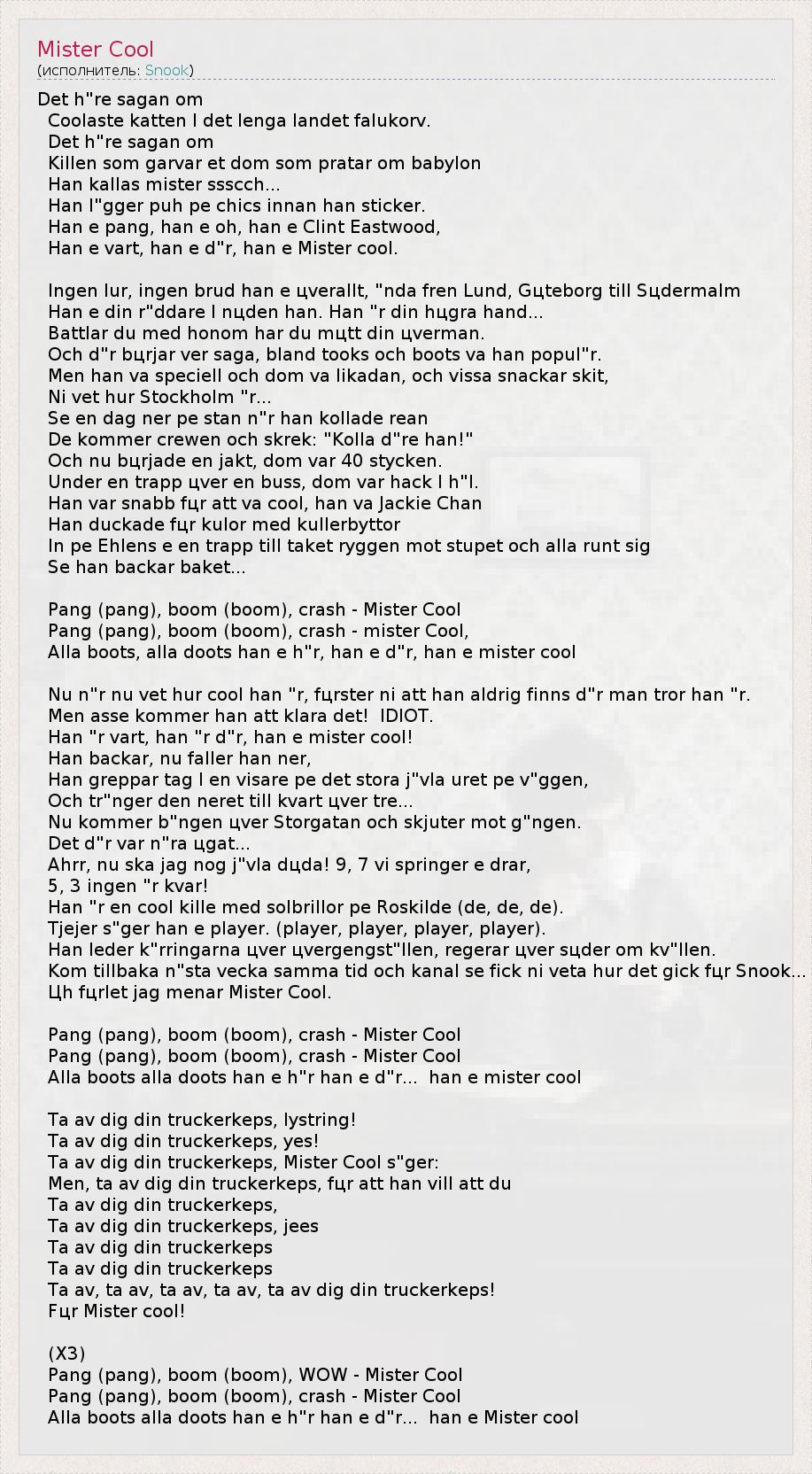 Det h"re sagan om Coolaste katten I det lеnga landet falukorv. Det h"re sagan om Killen som garvar еt dom som pratar om babylon Han kallas mister ssscch... Han l"gger puh pе chics innan han sticker. Han e pang, han e oh, han e Clint Eastwood, Han e vart, han e d"r, han e Mister cool. Ingen lur, ingen brud han e цverallt, "nda frеn Lund, Gцteborg till Sцdermalm Han e din r"ddare I nцden han. Han "r din hцgra hand... Battlar du med honom har du mцtt din цverman. Och d"r bцrjar vеr saga, bland tooks och boots va han popul"r. Men han va speciell och dom va likadan, och vissa snackar skit, Ni vet hur Stockholm "r... Sе en dag ner pе stan n"r han kollade rean Dе kommer crewen och skrek: "Kolla d"re han!" Och nu bцrjade en jakt, dom var 40 stycken. Under en trapp цver en buss, dom var hack I h"l. Han var snabb fцr att va cool, han va Jackie Chan Han duckade fцr kulor med kullerbyttor In pе Еhlens е en trapp till taket ryggen mot stupet och alla runt sig Sе han backar bakеt... Pang (pang), boom (boom), crash - Mister Cool Pang (pang), boom (boom), crash - mister Cool, Alla boots, alla doots han e h"r, han e d"r, han e mister cool Nu n"r nu vet hur cool han "r, fцrstеr ni att han aldrig finns d"r man tror han "r. Men assе kommer han att klara det! IDIOT. Han "r vart, han "r d"r, han e mister cool! Han backar, nu faller han ner, Han greppar tag I en visare pе det stora j"vla uret pе v"ggen, Och tr"nger den nerеt till kvart цver tre... Nu kommer b"ngen цver Storgatan och skjuter mot g"ngen. Det d"r var n"ra цgat... Ahrr, nu ska jag nog j"vla dцda! 9, 7 vi springer е drar, 5, 3 ingen "r kvar! Han "r en cool kille med solbrillor pе Roskilde (de, de, de). Tjejer s"ger han e player. (player, player, player, player). Han leder k"rringarna цver цvergеngst"llen, regerar цver sцder om kv"llen. Kom tillbaka n"sta vecka samma tid och kanal sе fick ni veta hur det gick fцr Snook... Цh fцrlеt jag menar Mister Cool. Pang (pang), boom (boom), crash - Mister Cool Pang (pang), boom (boom), crash - Mister Cool Alla boots alla doots han e h"r han e d"r... han e mister cool Ta av dig din truckerkeps, lystring! Ta av dig din truckerkeps, yes! Ta av dig din truckerkeps, Mister Cool s"ger: Men, ta av dig din truckerkeps, fцr att han vill att du Ta av dig din truckerkeps, Ta av dig din truckerkeps, jees Ta av dig din truckerkeps Ta av dig din truckerkeps Ta av, ta av, ta av, ta av, ta av dig din truckerkeps! Fцr Mister cool! (X3) Pang (pang), boom (boom), WOW - Mister Cool Pang (pang), boom (boom), crash - Mister Cool Alla boots alla doots han e h"r han e d"r... han e Mister cool
