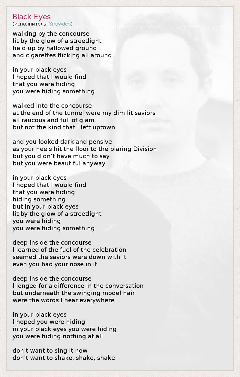 walking by the concourse lit by the glow of a streetlight held up by hallowed ground and cigarettes flicking all around in your black eyes I hoped that I would find that you were hiding you were hiding something walked into the concourse at the end of the tunnel were my dim lit saviors all raucous and full of glam but not the kind that I left uptown and you looked dark and pensive as your heels hit the floor to the blaring Division but you didn't have much to say but you were beautiful anyway in your black eyes I hoped that I would find that you were hiding hiding something but in your black eyes lit by the glow of a streetlight you were hiding you were hiding something deep inside the concourse I learned of the fuel of the celebration seemed the saviors were down with it even you had your nose in it deep inside the concourse I longed for a difference in the conversation but underneath the swinging model hair were the words I hear everywhere in your black eyes I hoped you were hiding in your black eyes you were hiding you were hiding nothing at all don't want to sing it now don't want to shake, shake, shake