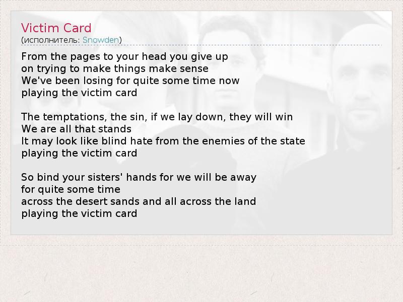 From the pages to your head you give up on trying to make things make sense We've been losing for quite some time now playing the victim card The temptations, the sin, if we lay down, they will win We are all that stands It may look like blind hate from the enemies of the state playing the victim card So bind your sisters' hands for we will be away for quite some time across the desert sands and all across the land playing the victim card