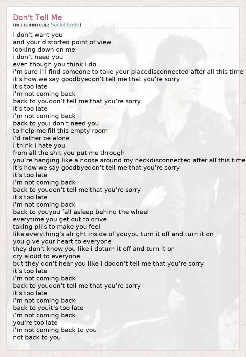 i don't want you and your distorted point of view looking down on me i don't need you even though you think i do i'm sure i'll find someone to take your placedisconnected after all this time it's how we say goodbyedon't tell me that you're sorry it's too late i'm not coming back back to youdon't tell me that you're sorry it's too late i'm not coming back back to youi don't need you to help me fill this empty room i'd rather be alone i think i hate you from all the shit you put me through you're hanging like a noose around my neckdisconnected after all this time it's how we say goodbyedon't tell me that you're sorry it's too late i'm not coming back back to youdon't tell me that you're sorry it's too late i'm not coming back back to youyou fall asleep behind the wheel everytime you get out to drive taking pills to make you feel like everything's alright inside of youyou turn it off and turn it on you give your heart to everyone they don't know you like i doturn it off and turn it on cry aloud to everyone but they don't hear you like i dodon't tell me that you're sorry it's too late i'm not coming back back to youdon't tell me that you're sorry it's too late i'm not coming back back to youit's too late i'm not coming back you're too late i'm not coming back to you not back to you