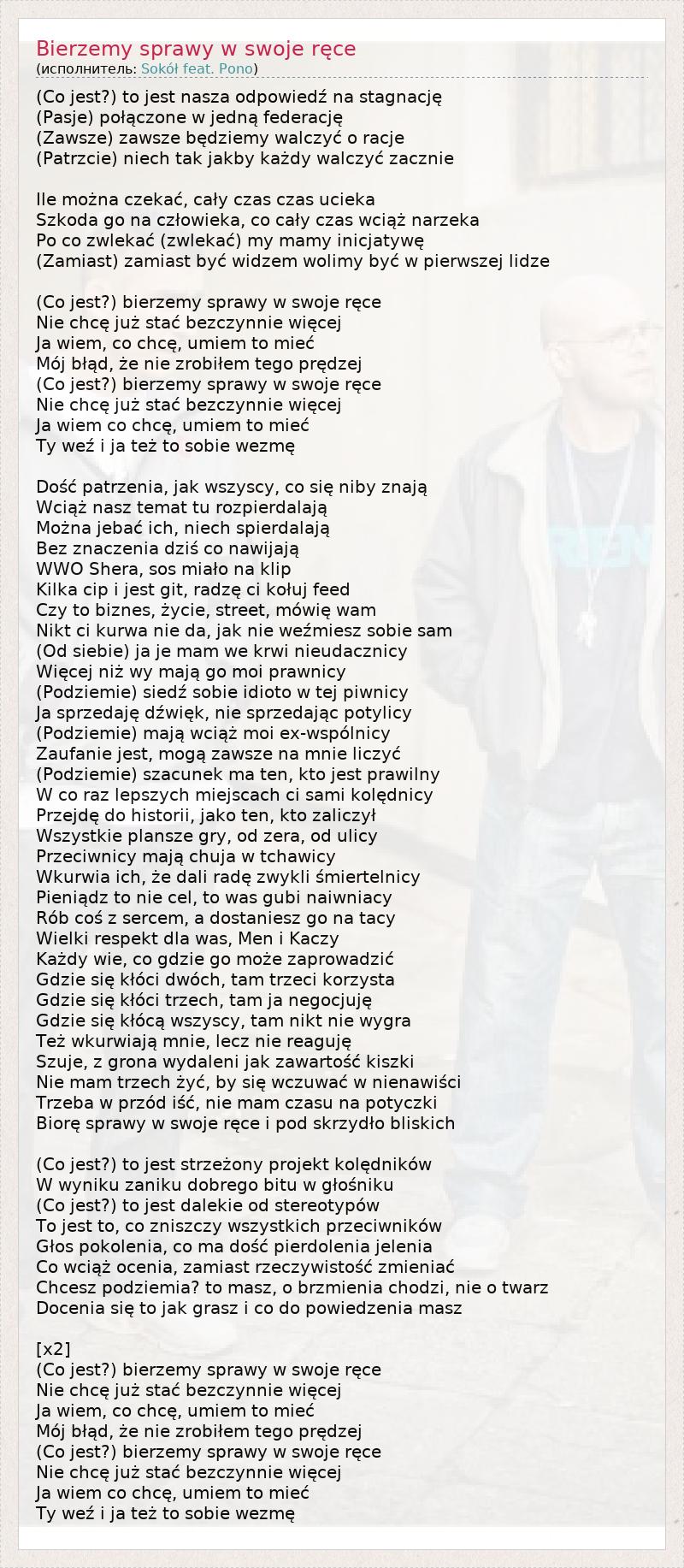 (Со шутка ? ) Шутить Nasza odpowiedź па stagnację ( Pasje ) połączone ж jedną federację ( Zawsze ) zawsze będziemy walczyć о racje ( Patrzcie ) niech Tak jakby każdy walczyć zacznie Иль można czekać , cały Каталог польских Каталог польских ucieka Szkoda идти па człowieka , со cały Каталог польских wciąż narzeka По сотрудничество zwlekać ( zwlekać ) мой мамы inicjatywę ( Zamiast ) zamiast BYC widzem wolimy BYC ж pierwszej lidze (Со шутка ? ) Bierzemy sprawy ж swoje Rece Nie chcę Юз STAC bezczynnie więcej Ja wiem , со chcę , umiem чтобы MIEC Mój Blad , że ние zrobiłem TEGO prędzej (Со шутка ? ) Bierzemy sprawy ж swoje Rece Nie chcę Юз STAC bezczynnie więcej Ja wiem со chcę , umiem чтобы MIEC Тай Wez я JA ТЭЦ в Sobie wezmę DOSC patrzenia , як wszyscy , со się niby znają Wciąż Nasz Темат ту rozpierdalają Można jebać ич , niech spierdalają Без znaczenia Дзись со nawijają WWO Шера , SOS МИАЛО па Клип Килька CIP я шутка мерзавец , radzę CI kołuj корма Czy чтобы БИЗНЕС , Zycie , улица, mówię WAM Nikt CI Kurwa ние да , як ние weźmiesz Sobie Сэм ( Од siebie ) JA JE мам мы krwi nieudacznicy Więcej Niz Вайоминг Maja идти Moi prawnicy ( Podziemie ) siedź Sobie idioto ж Tej piwnicy Ja sprzedaję dźwięk , не отнесенные к другим sprzedając potylicy ( Podziemie ) Maja wciąż Moi экс- Wspólnicy Zaufanie шутка , MOGA zawsze па mnie liczyć ( Podziemie ) szacunek ма десять, КТО шутка prawilny Вт со Раз lepszych miejscach CI Сами kolędnicy Przejdę сделать historii , яко десять, КТО zaliczył Wszystkie plansze игры , од зера , од ulicy Przeciwnicy Maja chuja ж tchawicy Wkurwia ич , że Дали Раде zwykli śmiertelnicy Pieniądz чтобы NIE чел , чтобы было Gubi naiwniacy Роб созг sercem ,dostaniesz идти па Tacy Вельки респект DLA было , Мужчины я Kaczy Każdy Ви , совместно gdzie идти Moze zaprowadzić Gdzie się kłóci dwóch , там trzeci korzysta Gdzie się kłóci Trzech , там JA negocjuję Gdzie się kłócą wszyscy , там nikt ние wygra ТЭЦ wkurwiają mnie , lecz ние reaguję Szuje , г Grona wydaleni як Zawartość kiszki Nie мам Trzech ZYC , по się wczuwać ж nienawiści Trzeba ж PRZÓD ISC , не отнесенные к другим мам czasu па potyczki Biore sprawy ж swoje Rece я стручок skrzydło bliskich (Со шутка ? ) Шутить strzeżony Projekt kolędników W wyniku zaniku Dobrego БНП ж głośniku (Со шутка ? ) Шутить dalekie од stereotypów Для шутить , чтобы , совместно zniszczy wszystkich przeciwników Glos pokolenia , со ма DOSC pierdolenia Еленя Со wciąż Океании , zamiast rzeczywistość zmieniać Chcesz podziemia ? чтобы MASZ , о brzmienia chodzi , не отнесенные к другим о twarz Docenia się к Jak grasz я совместно сделать powiedzenia MASZ [x2] (Со шутка ? ) Bierzemy sprawy ж swoje Rece Nie chcę Юз STAC bezczynnie więcej Ja wiem , со chcę , umiem чтобы MIEC Mój Blad , że ние zrobiłem TEGO prędzej (Со шутка ? ) Bierzemy sprawy ж swoje Rece Nie chcę Юз STAC bezczynnie więcej Ja wiem со chcę , umiem чтобы MIEC Тай Wez я JA ТЭЦ в Sobie wezmę
