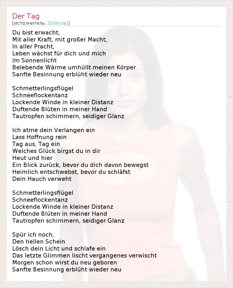 Du bist erwacht, Mit aller Kraft, mit großer Macht, In aller Pracht, Leben wächst für dich und mich Im Sonnenlicht Belebende Wärme umhüllt meinen Körper Sanfte Besinnung erblüht wieder neu Schmetterlingsflügel Schneeflockentanz Lockende Winde in kleiner Distanz Duftende Blüten in meiner Hand Tautropfen schimmern, seidiger Glanz Ich atme dein Verlangen ein Lass Hoffnung rein Tag aus, Tag ein Welches Glück birgst du in dir Heut und hier Ein Blick zurück, bevor du dich davon bewegst Heimlich entschwebst, bevor du schläfst Dein Hauch verweht Schmetterlingsflügel Schneeflockentanz Lockende Winde in kleiner Distanz Duftende Blüten in meiner Hand Tautropfen schimmern, seidiger Glanz Spür ich noch, Den hellen Schein Lösch dein Licht und schlafe ein Das letzte Glimmen lischt vergangenes verwischt Morgen schon wirst du neu geboren Sanfte Besinnung erblüht wieder neu