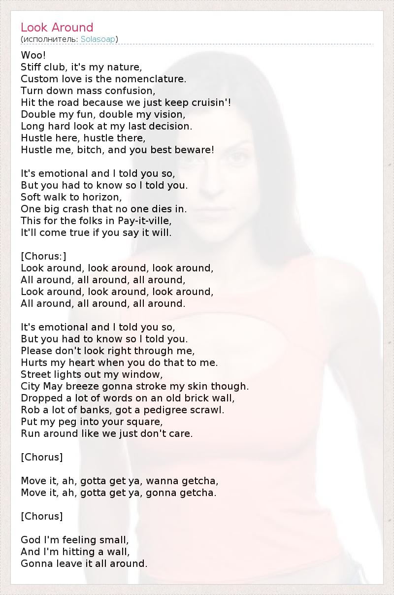 Woo! Stiff club, it's my nature, Сustom love is the nomenclature. Turn down mass confusion, Hit the road because we just keep cruisin'! Double my fun, double my vision, Long hard look at my last decision. Hustle here, hustle there, Hustle me, bitch, and you best beware! It's emotional and I told you so, But you had to know so I told you. Soft walk to horizon, One big crash that no one dies in. This for the folks in Pay-it-ville, It'll come true if you say it will. [Chorus:] Look around, look around, look around, All around, all around, all around, Look around, look around, look around, All around, all around, all around. It's emotional and I told you so, But you had to know so I told you. Please don't look right through me, Hurts my heart when you do that to me. Street lights out my window, City May breeze gonna stroke my skin though. Dropped a lot of words on an old brick wall, Rob a lot of banks, got a pedigree scrawl. Put my peg into your square, Run around like we just don't care. [Chorus] Move it, ah, gotta get ya, wanna getcha, Move it, ah, gotta get ya, gonna getcha. [Chorus] God I'm feeling small, And I'm hitting a wall, Gonna leave it all around.