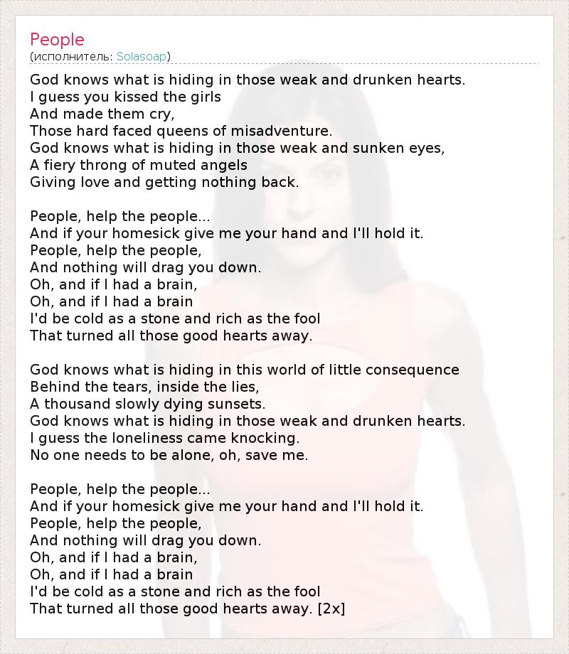 God knows what is hiding in those weak and drunken hearts. I guess you kissed the girls And made them cry, Those hard faced queens of misadventure. God knows what is hiding in those weak and sunken eyes, A fiery throng of muted angels Giving love and getting nothing back. People, help the people... And if your homesick give me your hand and I'll hold it. People, help the people, And nothing will drag you down. Oh, and if I had a brain, Oh, and if I had a brain I'd be cold as a stone and rich as the fool That turned all those good hearts away. God knows what is hiding in this world of little consequence Behind the tears, inside the lies, A thousand slowly dying sunsets. God knows what is hiding in those weak and drunken hearts. I guess the loneliness came knocking. No one needs to be alone, oh, save me. People, help the people... And if your homesick give me your hand and I'll hold it. People, help the people, And nothing will drag you down. Oh, and if I had a brain, Oh, and if I had a brain I'd be cold as a stone and rich as the fool That turned all those good hearts away. [2x]