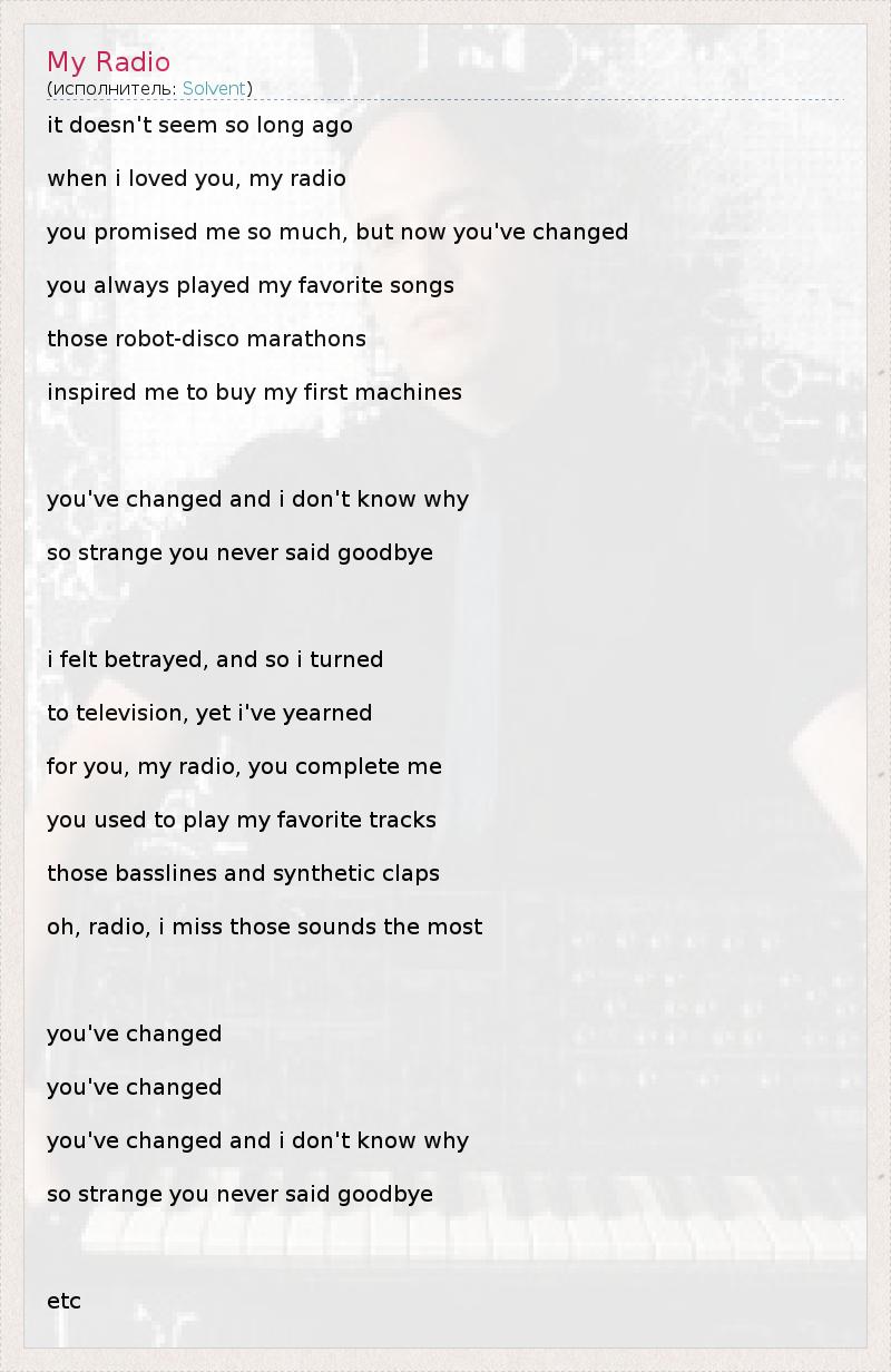 it doesn't seem so long ago when i loved you, my radio you promised me so much, but now you've changed you always played my favorite songs those robot-disco marathons inspired me to buy my first machines you've changed and i don't know why so strange you never said goodbye i felt betrayed, and so i turned to television, yet i've yearned for you, my radio, you complete me you used to play my favorite tracks those basslines and synthetic claps oh, radio, i miss those sounds the most you've changed you've changed you've changed and i don't know why so strange you never said goodbye etc