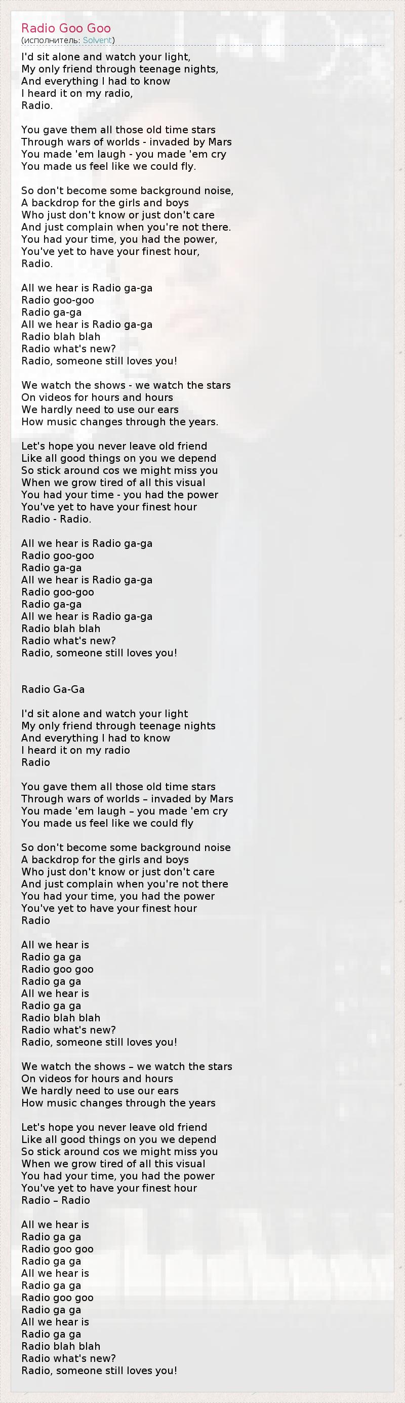 I'd sit alone and watch your light, My only friend through teenage nights, And everything I had to know I heard it on my radio, Radio. You gave them all those old time stars Through wars of worlds - invaded by Mars You made 'em laugh - you made 'em cry You made us feel like we could fly. So don't become some background noise, A backdrop for the girls and boys Who just don't know or just don't care And just complain when you're not there. You had your time, you had the power, You've yet to have your finest hour, Radio. All we hear is Radio ga-ga Radio goo-goo Radio ga-ga All we hear is Radio ga-ga Radio blah blah Radio what's new? Radio, someone still loves you! We watch the shows - we watch the stars On videos for hours and hours We hardly need to use our ears How music changes through the years. Let's hope you never leave old friend Like all good things on you we depend So stick around cos we might miss you When we grow tired of all this visual You had your time - you had the power You've yet to have your finest hour Radio - Radio. All we hear is Radio ga-ga Radio goo-goo Radio ga-ga All we hear is Radio ga-ga Radio goo-goo Radio ga-ga All we hear is Radio ga-ga Radio blah blah Radio what's new? Radio, someone still loves you! Radio Ga-Ga I'd sit alone and watch your light My only friend through teenage nights And everything I had to know I heard it on my radio Radio You gave them all those old time stars Through wars of worlds – invaded by Mars You made 'em laugh – you made 'em cry You made us feel like we could fly So don't become some background noise A backdrop for the girls and boys Who just don't know or just don't care And just complain when you're not there You had your time, you had the power You've yet to have your finest hour Radio All we hear is Radio ga ga Radio goo goo Radio ga ga All we hear is Radio ga ga Radio blah blah Radio what's new? Radio, someone still loves you! We watch the shows – we watch the stars On videos for hours and hours We hardly need to use our ears How music changes through the years Let's hope you never leave old friend Like all good things on you we depend So stick around cos we might miss you When we grow tired of all this visual You had your time, you had the power You've yet to have your finest hour Radio – Radio All we hear is Radio ga ga Radio goo goo Radio ga ga All we hear is Radio ga ga Radio goo goo Radio ga ga All we hear is Radio ga ga Radio blah blah Radio what's new? Radio, someone still loves you!