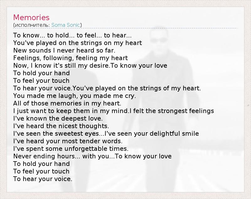 To know... to hold... to feel... to hear... You've played on the strings on my heart New sounds I never heard so far. Feelings, following, feeling my heart Now, I know it's still my desire.To know your love To hold your hand To feel your touch To hear your voice.You've played on the strings of my heart. You made me laugh, you made me cry. All of those memories in my heart. I just want to keep them in my mind.I felt the strongest feelings I've known the deepest love. I've heard the nicest thoughts. I've seen the sweetest eyes...I've seen your delightful smile I've heard your most tender words. I've spent some unforgettable times. Never ending hours... with you...To know your love To hold your hand To feel your touch To hear your voice.
