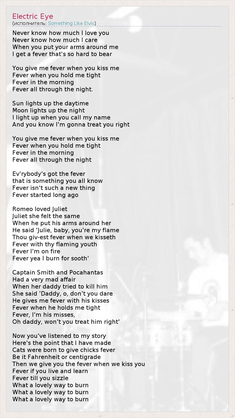 Never know how much I love you Never know how much I care When you put your arms around me I get a fever that's so hard to bear You give me fever when you kiss me Fever when you hold me tight Fever in the morning Fever all through the night. Sun lights up the daytime Moon lights up the night I light up when you call my name And you know I'm gonna treat you right You give me fever when you kiss me Fever when you hold me tight Fever in the morning Fever all through the night Ev'rybody's got the fever that is something you all know Fever isn't such a new thing Fever started long ago Romeo loved Juliet Juliet she felt the same When he put his arms around her He said 'Julie, baby, you're my flame Thou giv-est fever when we kisseth Fever with thy flaming youth Fever I'm on fire Fever yea I burn for sooth' Captain Smith and Pocahantas Had a very mad affair When her daddy tried to kill him She said 'Daddy, o, don't you dare He gives me fever with his kisses Fever when he holds me tight Fever, I'm his misses, Oh daddy, won't you treat him right' Now you've listened to my story Here's the point that I have made Cats were born to give chicks fever Be it Fahrenheit or centigrade Then we give you the fever when we kiss you Fever if you live and learn Fever till you sizzle What a lovely way to burn What a lovely way to burn What a lovely way to burn