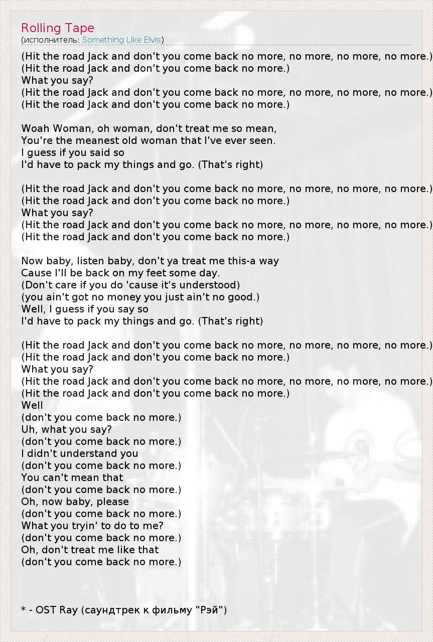 (Hit the road Jack and don't you come back no more, no more, no more, no more.) (Hit the road Jack and don't you come back no more.) What you say? (Hit the road Jack and don't you come back no more, no more, no more, no more.) (Hit the road Jack and don't you come back no more.) Woah Woman, oh woman, don't treat me so mean, You're the meanest old woman that I've ever seen. I guess if you said so I'd have to pack my things and go. (That's right) (Hit the road Jack and don't you come back no more, no more, no more, no more.) (Hit the road Jack and don't you come back no more.) What you say? (Hit the road Jack and don't you come back no more, no more, no more, no more.) (Hit the road Jack and don't you come back no more.) Now baby, listen baby, don't ya treat me this-a way Cause I'll be back on my feet some day. (Don't care if you do 'cause it's understood) (you ain't got no money you just ain't no good.) Well, I guess if you say so I'd have to pack my things and go. (That's right) (Hit the road Jack and don't you come back no more, no more, no more, no more.) (Hit the road Jack and don't you come back no more.) What you say? (Hit the road Jack and don't you come back no more, no more, no more, no more.) (Hit the road Jack and don't you come back no more.) Well (don't you come back no more.) Uh, what you say? (don't you come back no more.) I didn't understand you (don't you come back no more.) You can't mean that (don't you come back no more.) Oh, now baby, please (don't you come back no more.) What you tryin' to do to me? (don't you come back no more.) Oh, don't treat me like that (don't you come back no more.) * - OST Ray (саундтрек к фильму "Рэй")