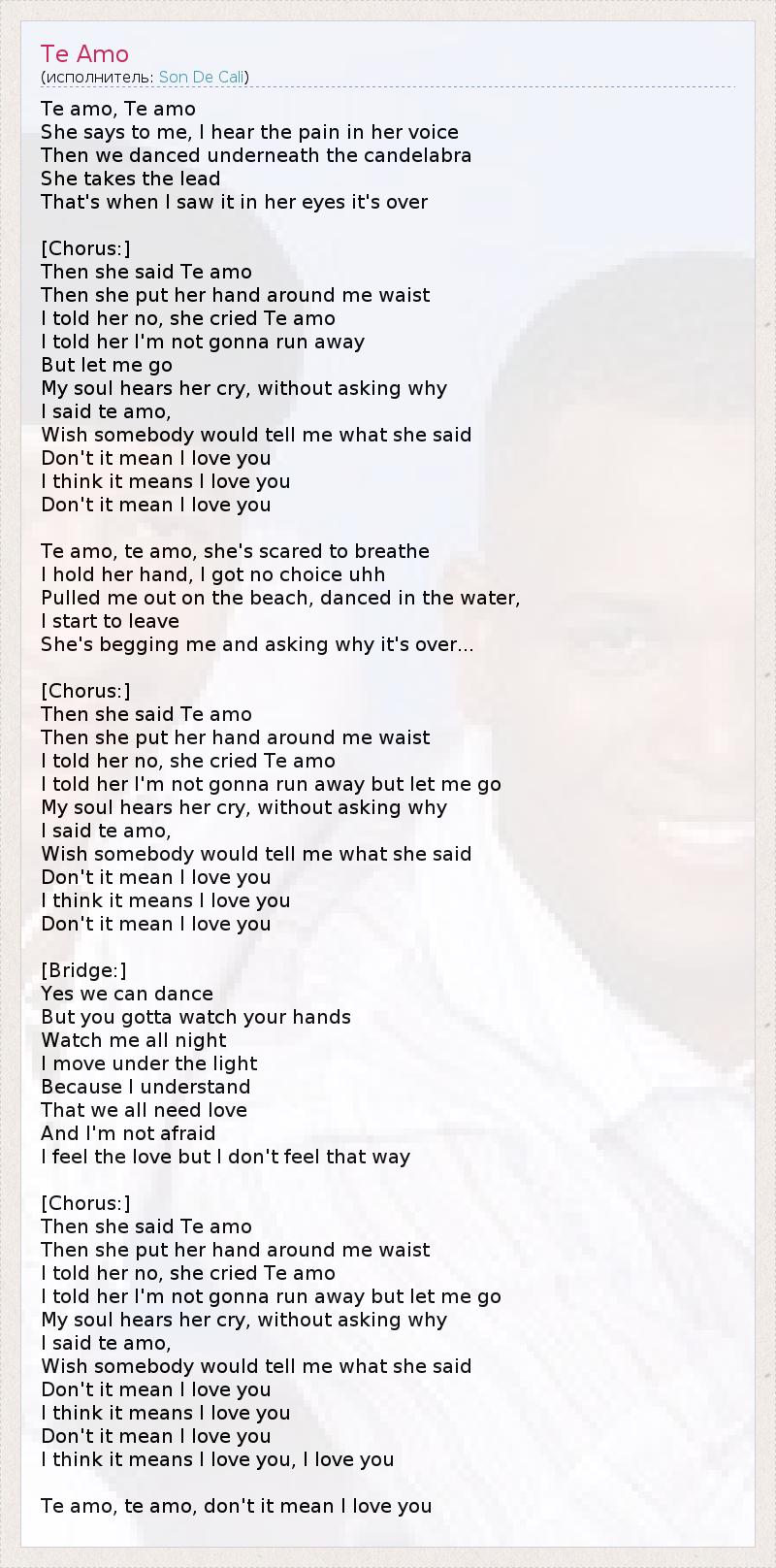 "Te amo, Te amo", Сказала она мне, я почувствовала боль в ее голосе. Затем мы танцевали при свечах, она вела, Тогда я увидела в ее глазах, что всё кончено... [Припев:] Затем она сказала: "Te amo" И положила руку мне на талию, Я сказала "Нет". Она вскрикнула: "Te amo", Я сказала ей: "Я не собираюсь убегать, но отпусти меня!" Душой я слышала её безмолвный плач, без лишних вопросов Я сказала "Te amo". Хотелось бы, чтобы кто-нибудь объяснил мне эти слова... Разве это значит не "Я люблю тебя"? Думаю, это значит, "Я люблю тебя"... Разве это значит не "Я люблю тебя"? "Te amo", она боялась сделать вдох, Я взяла ее за руку, у меня не было выбора. Она вытащила меня на пляж, мы танцевали в воде, Я начала собираться домой, А она стала умолять меня и спрашивать: Почему все кончено... [Припев:] Затем она сказала: "Te amo" и положила руку мне на талию, Я сказала "Нет". Она вскрикнула: "Te amo", Я сказала ей: "Я не собираюсь убегать, но отпусти меня!" Душой я слышала её безмолвный плач, без лишних вопросов Я сказала "Te amo". Хотелось бы, чтобы кто-нибудь объяснил мне эти слова... Разве это значит не "Я люблю тебя"? Думаю, это значит, "Я люблю тебя"... Разве это значит не "Я люблю тебя"? [Переход:] Послушай, мы можем потанцевать, Но ты лучше следи за своими руками.... Наблюдаешь за мной всю ночь... Я двигаюсь при свете, Потому что понимаю, Что нам всем нужна любовь, И я не боюсь - Я люблю тебя, но не в том смысле, как ты этого хочешь... [Припев:] Затем она сказала: "Te amo" и положила руку мне на талию, Я сказала "Нет". Она вскрикнула: "Te amo", Я сказала ей: "Я не собираюсь убегать, но отпусти меня!" Душой я слышала её безмолвный плач, без лишних вопросов Я сказала "Te amo". Хотелось бы, чтобы кто-нибудь объяснил мне эти слова... Разве это значит не "Я люблю тебя"? Думаю, это значит, "Я люблю тебя"... Разве это значит не "Я люблю тебя"? Думаю, это значит, "Я люблю тебя", "Я люблю тебя"... Te amo, te amo, разве это значит не "Я люблю тебя"??