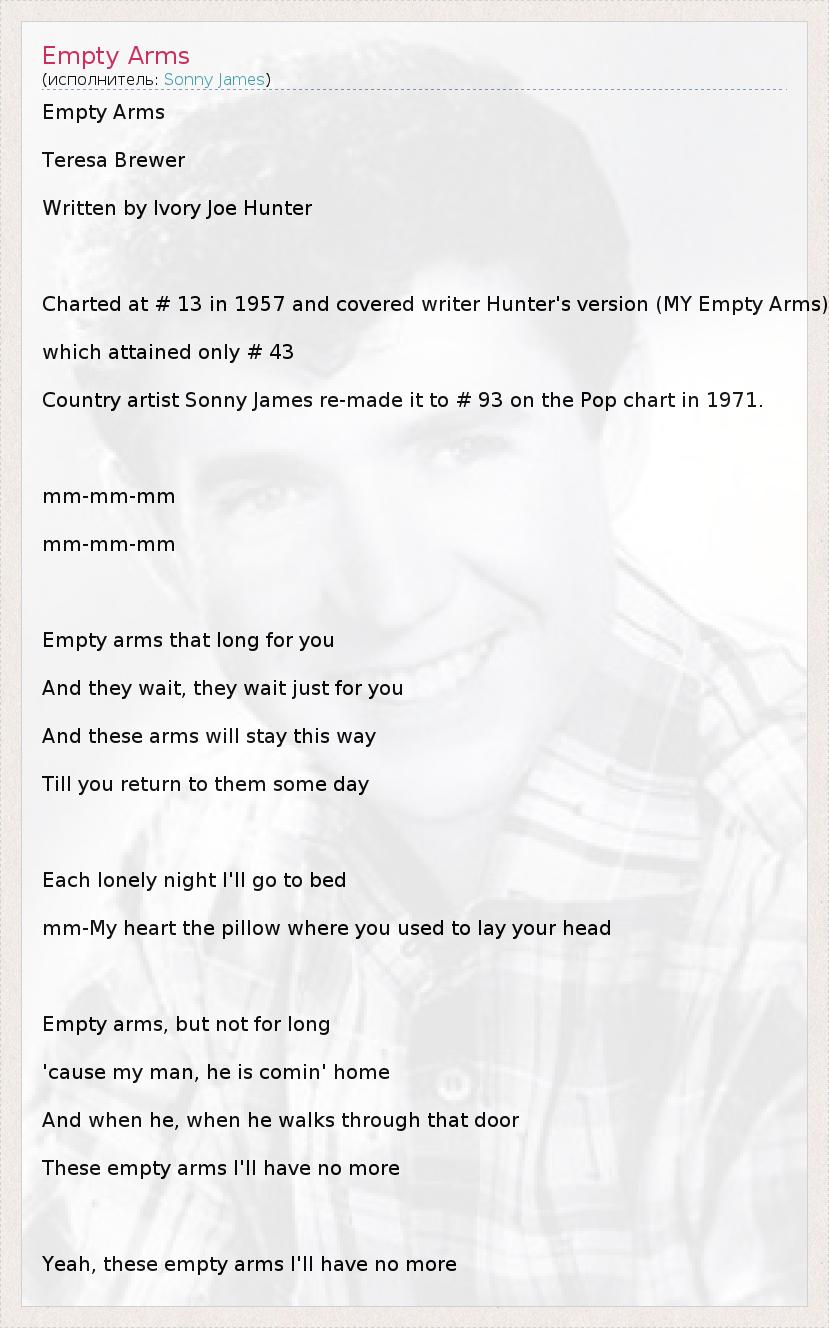 Empty Arms Teresa Brewer Written by Ivory Joe Hunter Charted at # 13 in 1957 and covered writer Hunter's version (MY Empty Arms) which attained only # 43 Country artist Sonny James re-made it to # 93 on the Pop chart in 1971. mm-mm-mm mm-mm-mm Empty arms that long for you And they wait, they wait just for you And these arms will stay this way Till you return to them some day Each lonely night I'll go to bed mm-My heart the pillow where you used to lay your head Empty arms, but not for long 'cause my man, he is comin' home And when he, when he walks through that door These empty arms I'll have no more Yeah, these empty arms I'll have no more
