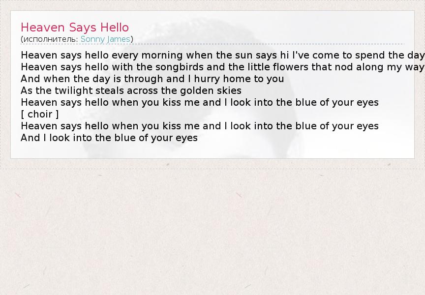 Heaven says hello every morning when the sun says hi I've come to spend the day Heaven says hello with the songbirds and the little flowers that nod along my way And when the day is through and I hurry home to you As the twilight steals across the golden skies Heaven says hello when you kiss me and I look into the blue of your eyes [ choir ] Heaven says hello when you kiss me and I look into the blue of your eyes And I look into the blue of your eyes