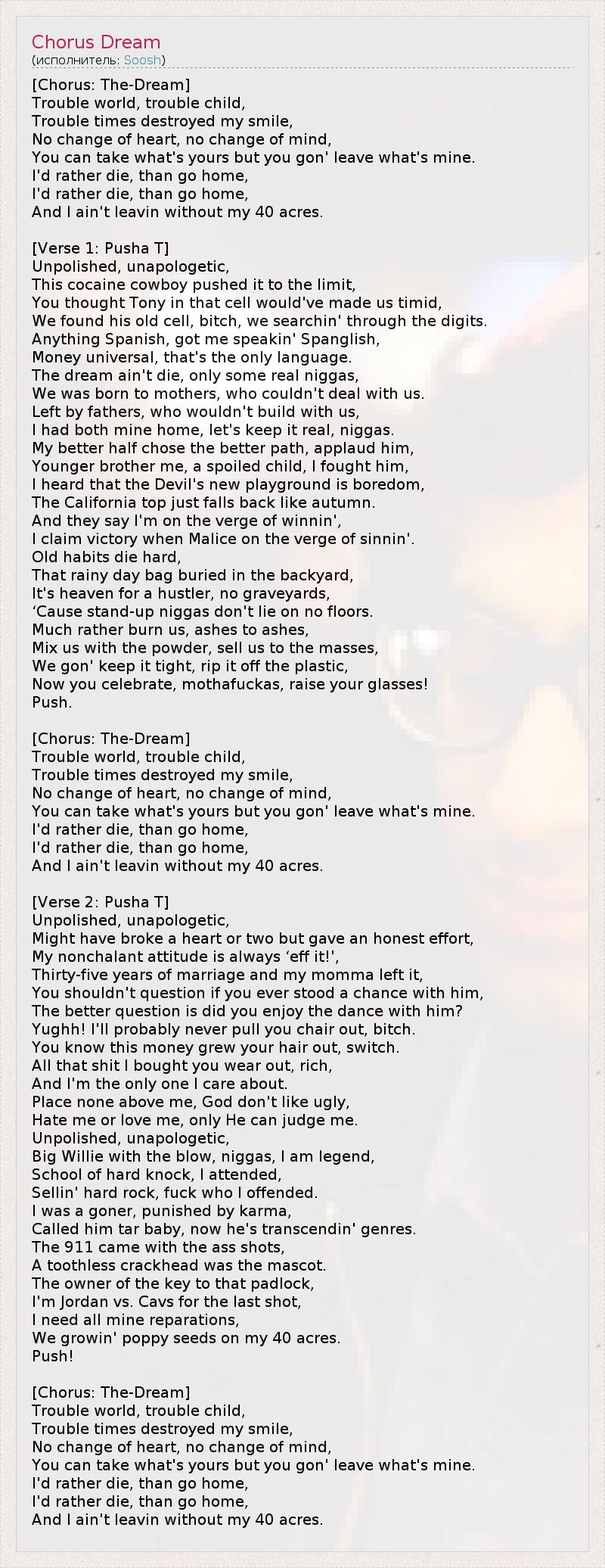 [Chorus: The-Dream] Trouble world, trouble child, Trouble times destroyed my smile, No change of heart, no change of mind, You can take what's yours but you gon' leave what's mine. I'd rather die, than go home, I'd rather die, than go home, And I ain't leavin without my 40 acres. [Verse 1: Pusha T] Unpolished, unapologetic, This cocaine cowboy pushed it to the limit, You thought Tony in that cell would've made us timid, We found his old cell, bitch, we searchin' through the digits. Anything Spanish, got me speakin' Spanglish, Money universal, that's the only language. The dream ain't die, only some real niggas, We was born to mothers, who couldn't deal with us. Left by fathers, who wouldn't build with us, I had both mine home, let's keep it real, niggas. My better half chose the better path, applaud him, Younger brother me, a spoiled child, I fought him, I heard that the Devil's new playground is boredom, The California top just falls back like autumn. And they say I'm on the verge of winnin', I claim victory when Malice on the verge of sinnin'. Old habits die hard, That rainy day bag buried in the backyard, It's heaven for a hustler, no graveyards, ‘Cause stand-up niggas don't lie on no floors. Much rather burn us, ashes to ashes, Mix us with the powder, sell us to the masses, We gon' keep it tight, rip it off the plastic, Now you celebrate, mothafuckas, raise your glasses! Push. [Chorus: The-Dream] Trouble world, trouble child, Trouble times destroyed my smile, No change of heart, no change of mind, You can take what's yours but you gon' leave what's mine. I'd rather die, than go home, I'd rather die, than go home, And I ain't leavin without my 40 acres. [Verse 2: Pusha T] Unpolished, unapologetic, Might have broke a heart or two but gave an honest effort, My nonchalant attitude is always ‘eff it!', Thirty-five years of marriage and my momma left it, You shouldn't question if you ever stood a chance with him, The better question is did you enjoy the dance with him? Yughh! I'll probably never pull you chair out, bitch. You know this money grew your hair out, switch. All that shit I bought you wear out, rich, And I'm the only one I care about. Place none above me, God don't like ugly, Hate me or love me, only He can judge me. Unpolished, unapologetic, Big Willie with the blow, niggas, I am legend, School of hard knock, I attended, Sellin' hard rock, fuck who I offended. I was a goner, punished by karma, Called him tar baby, now he's transcendin' genres. The 911 came with the ass shots, A toothless crackhead was the mascot. The owner of the key to that padlock, I'm Jordan vs. Cavs for the last shot, I need all mine reparations, We growin' poppy seeds on my 40 acres. Push! [Chorus: The-Dream] Trouble world, trouble child, Trouble times destroyed my smile, No change of heart, no change of mind, You can take what's yours but you gon' leave what's mine. I'd rather die, than go home, I'd rather die, than go home, And I ain't leavin without my 40 acres.