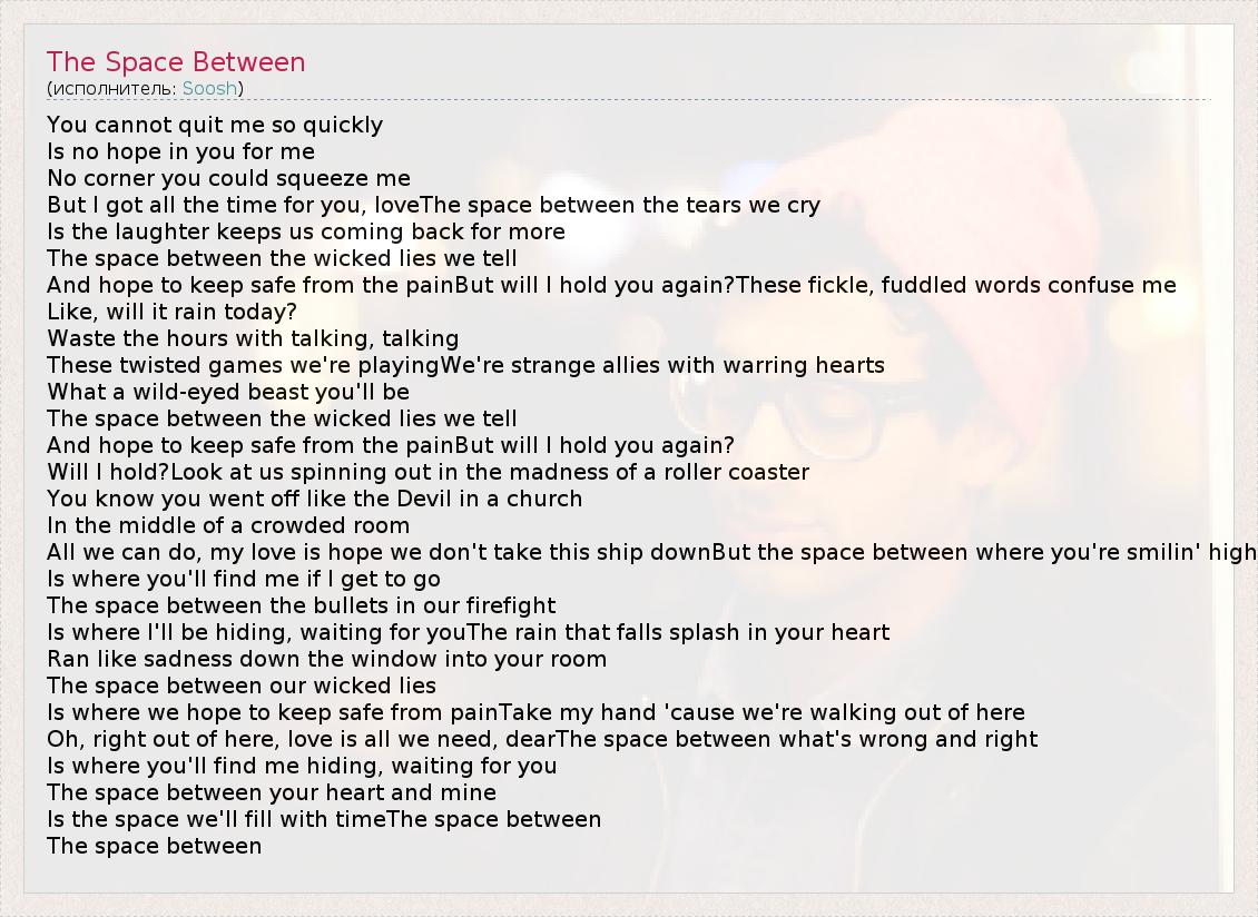 You cannot quit me so quickly Is no hope in you for me No corner you could squeeze me But I got all the time for you, loveThe space between the tears we cry Is the laughter keeps us coming back for more The space between the wicked lies we tell And hope to keep safe from the painBut will I hold you again?These fickle, fuddled words confuse me Like, will it rain today? Waste the hours with talking, talking These twisted games we're playingWe're strange allies with warring hearts What a wild-eyed beast you'll be The space between the wicked lies we tell And hope to keep safe from the painBut will I hold you again? Will I hold?Look at us spinning out in the madness of a roller coaster You know you went off like the Devil in a church In the middle of a crowded room All we can do, my love is hope we don't take this ship downBut the space between where you're smilin' high Is where you'll find me if I get to go The space between the bullets in our firefight Is where I'll be hiding, waiting for youThe rain that falls splash in your heart Ran like sadness down the window into your room The space between our wicked lies Is where we hope to keep safe from painTake my hand 'cause we're walking out of here Oh, right out of here, love is all we need, dearThe space between what's wrong and right Is where you'll find me hiding, waiting for you The space between your heart and mine Is the space we'll fill with timeThe space between The space between