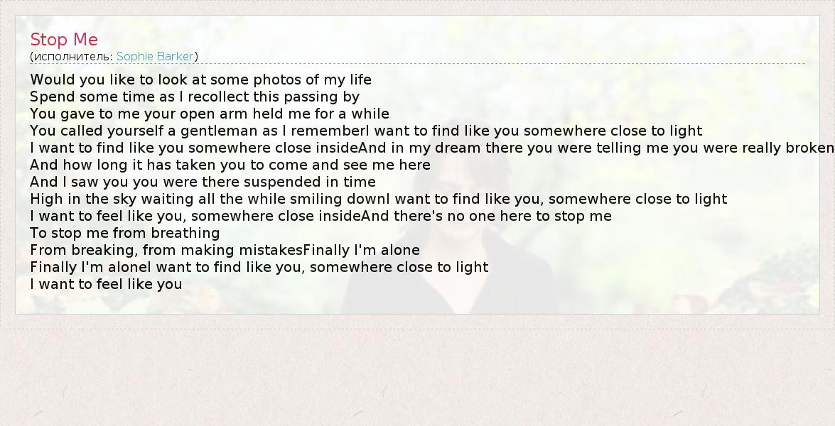 Would you like to look at some photos of my life Spend some time as I recollect this passing by You gave to me your open arm held me for a while You called yourself a gentleman as I rememberI want to find like you somewhere close to light I want to find like you somewhere close insideAnd in my dream there you were telling me you were really broken And how long it has taken you to come and see me here And I saw you you were there suspended in time High in the sky waiting all the while smiling downI want to find like you, somewhere close to light I want to feel like you, somewhere close insideAnd there's no one here to stop me To stop me from breathing From breaking, from making mistakesFinally I'm alone Finally I'm aloneI want to find like you, somewhere close to light I want to feel like you