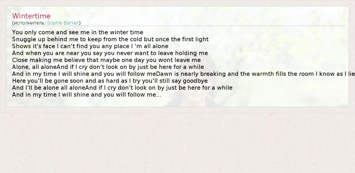 You only come and see me in the winter time Snuggle up behind me to keep from the cold but once the first light Shows it's face I can't find you any place I 'm all alone And when you are near you say you never want to leave holding me Close making me believe that maybe one day you wont leave me Alone, all aloneAnd if I cry don't look on by just be here for a while And in my time I will shine and you will follow meDawn is nearly breaking and the warmth fills the room I know as I lie Here you'll be gone soon and as hard as I try you'll still say goodbye And I'll be alone all aloneAnd if I cry don't look on by just be here for a while And in my time I will shine and you will follow me...