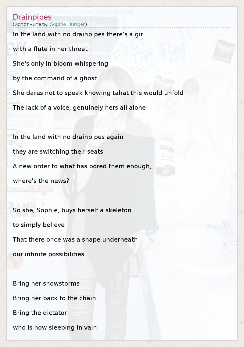 In the land with no drainpipes there's a girl with a flute in her throat She's only in bloom whispering by the command of a ghost She dares not to speak knowing tahat this would unfold The lack of a voice, genuinely hers all alone In the land with no drainpipes again they are switching their seats A new order to what has bored them enough, where's the news? So she, Sophie, buys herself a skeleton to simply believe That there once was a shape underneath our infinite possibilities Bring her snowstorms Bring her back to the chain Bring the dictator who is now sleeping in vain