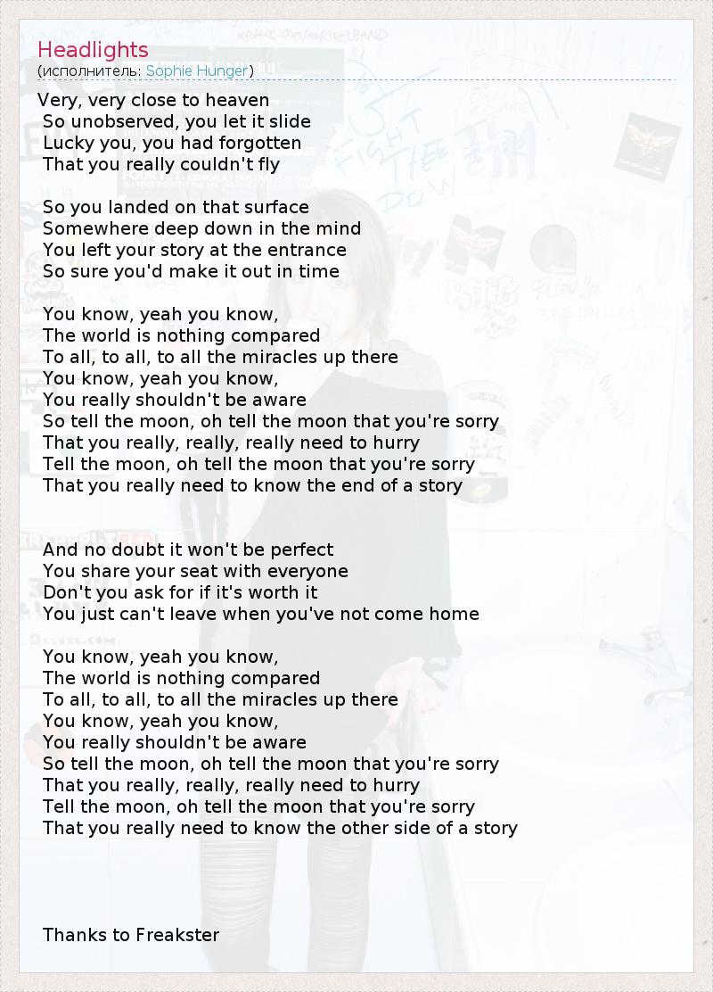 Very, very close to heaven So unobserved, you let it slide Lucky you, you had forgotten That you really couldn't fly So you landed on that surface Somewhere deep down in the mind You left your story at the entrance So sure you'd make it out in time You know, yeah you know, The world is nothing compared To all, to all, to all the miracles up there You know, yeah you know, You really shouldn't be aware So tell the moon, oh tell the moon that you're sorry That you really, really, really need to hurry Tell the moon, oh tell the moon that you're sorry That you really need to know the end of a story And no doubt it won't be perfect You share your seat with everyone Don't you ask for if it's worth it You just can't leave when you've not come home You know, yeah you know, The world is nothing compared To all, to all, to all the miracles up there You know, yeah you know, You really shouldn't be aware So tell the moon, oh tell the moon that you're sorry That you really, really, really need to hurry Tell the moon, oh tell the moon that you're sorry That you really need to know the other side of a story Thanks to Freakster