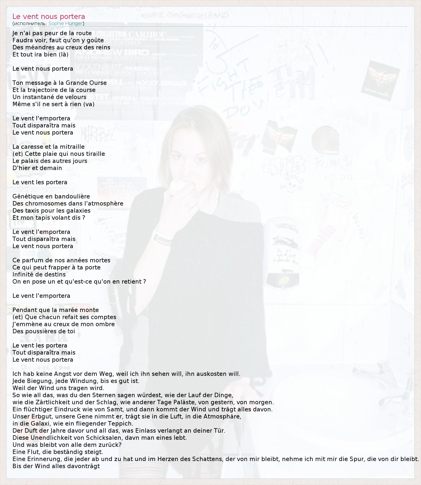 Je n'ai па Peur -де-ла маршрут Faudra ВОИР , Faut qu'on у goûte Des méandres а.е. Кре де вожжи Et рекламируют ира Bien (LA) Le Vent нус Portera Тон сообщение а-ля Большая Медведица Et ла trajectoire -де-ла Конечно Un instantané де велюр Même s'il пе Серт à Rien ( ва ) Le Vent l' emportera Tout disparaîtra Mais Le Vent нус Portera Ла Caresse др. ла mitraille (эт ) Cette plaie Квай ноус tiraille Le Palais Des Autres Jours D' иерархи и др. Demain Le Vent ле Portera Génétique ан bandoulière Des хромосомы данс L'Atmosphere Des такси залить ле галактики Et пн Tapis Volant рас ? Le Vent l' emportera Tout disparaîtra Mais Le Vent нус Portera Се парфюм де NOS années Mortes Се Квай Peut frapper ТА Porte Бесконечные де Destins На ан представляют ООН и др. qu'est - се qu'on ан retient ? Le Vent l' emportera Подвеска дие Ла Маре Монте (эт ) Que Chacun REFAIT Ses Comptes J'emmène а.е. Кре де пн ломбер Де Poussières DE TOI Le Vent ле Portera Tout disparaîtra Mais Le Vent нус Portera Ich хаб Keine Angst вор дем Weg , Вейля ич IHN Sehen воля , IHN auskosten воля . Jede Biegung , Jede Windung , бис эс кишки ист . Weil дер Wind UNS Tragen WIRD . Так Ви все дас , был дю ден Sternen Sagen würdest , Ви -дер- Lauf дер Dinge , Wie умереть Zärtlichkeit унд дер Schlag , Ви Anderer Tage Paläste , фон Gestern , фон Морген . Эйн flüchtiger Eindruck Wie фон Samt , унд Данн Kommt дер Ветер унд trägt Alles Davon . Unser Erbgut , Unsere Джин nimmt э-э, trägt Sie в фильеры Luft , в пресс-формы Atmosphäre , в пресс-формы Galaxi , Wie Эйн Fliegender Teppich . Der Duft дер Jahre Давор унд все дас , был Einlass verlangt в deiner Тур . Diese Unendlichkeit фон Schicksalen , davn человек Eines ЛЭЛТ . Und был bleibt фон алле дем zurück ? Eine Flut , умирают Beständig steigt . Eine Erinnerung , умирают Jeder аб унд цу шляпа унд внутримышечно Герцен де Schattens , дер фон мир bleibt , Nehme ич мит мир умрет Spur , умереть фон реж bleibt . Бис дер Ветер Alles davonträgt