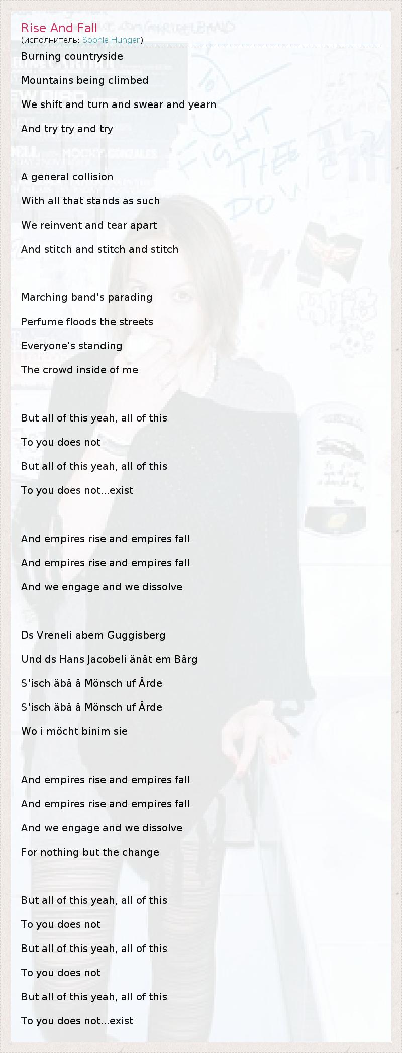 Burning countryside Mountains being climbed We shift and turn and swear and yearn And try try and try A general collision With all that stands as such We reinvent and tear apart And stitch and stitch and stitch Marching band's parading Perfume floods the streets Everyone's standing The crowd inside of me But all of this yeah, all of this To you does not But all of this yeah, all of this To you does not...exist And empires rise and empires fall And empires rise and empires fall And we engage and we dissolve Ds Vreneli abem Guggisberg Und ds Hans Jacobeli änät em Bärg S'isch äbä ä Mönsch uf Ärde S'isch äbä ä Mönsch uf Ärde Wo i möcht binim sie And empires rise and empires fall And empires rise and empires fall And we engage and we dissolve For nothing but the change But all of this yeah, all of this To you does not But all of this yeah, all of this To you does not But all of this yeah, all of this To you does not...exist