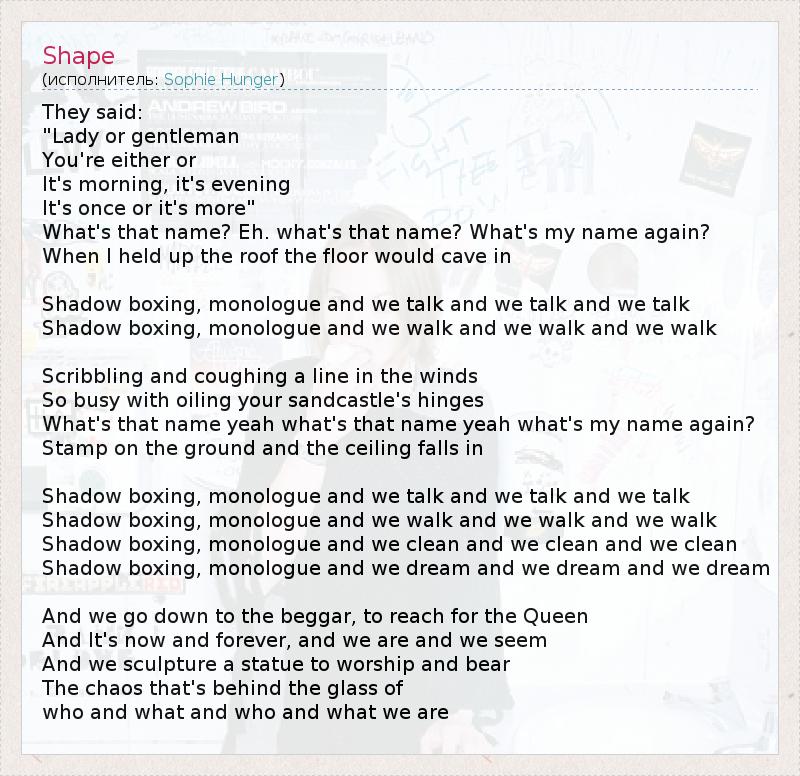 They said: "Lady or gentleman You're either or It's morning, it's evening It's once or it's more" What's that name? Eh. what's that name? What's my name again? When I held up the roof the floor would cave in Shadow boxing, monologue and we talk and we talk and we talk Shadow boxing, monologue and we walk and we walk and we walk Scribbling and coughing a line in the winds So busy with oiling your sandcastle's hinges What's that name yeah what's that name yeah what's my name again? Stamp on the ground and the ceiling falls in Shadow boxing, monologue and we talk and we talk and we talk Shadow boxing, monologue and we walk and we walk and we walk Shadow boxing, monologue and we clean and we clean and we clean Shadow boxing, monologue and we dream and we dream and we dream And we go down to the beggar, to reach for the Queen And It's now and forever, and we are and we seem And we sculpture a statue to worship and bear The chaos that's behind the glass of who and what and who and what we are