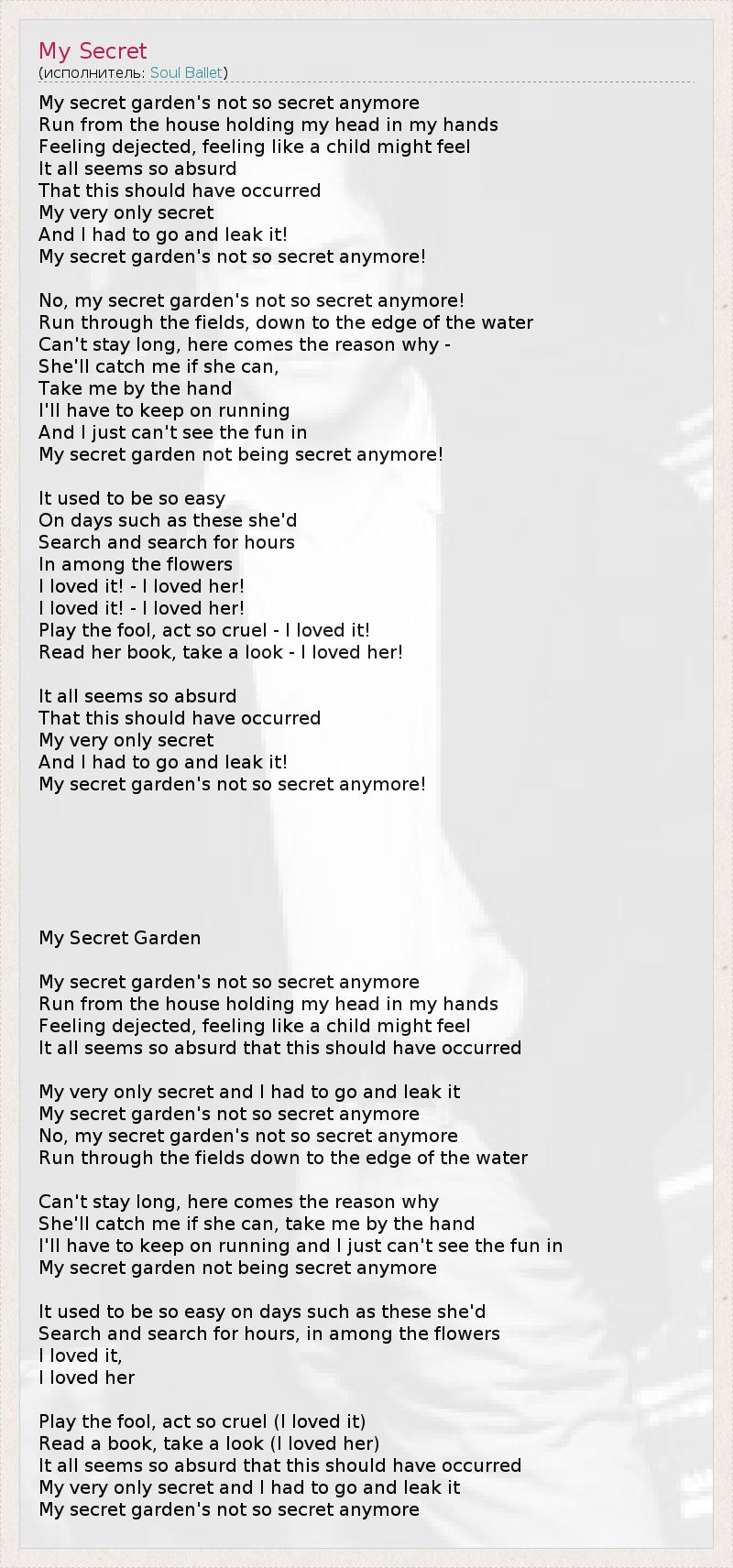My secret garden's not so secret anymore Run from the house holding my head in my hands Feeling dejected, feeling like a child might feel It all seems so absurd That this should have occurred My very only secret And I had to go and leak it! My secret garden's not so secret anymore! No, my secret garden's not so secret anymore! Run through the fields, down to the edge of the water Can't stay long, here comes the reason why - She'll catch me if she can, Take me by the hand I'll have to keep on running And I just can't see the fun in My secret garden not being secret anymore! It used to be so easy On days such as these she'd Search and search for hours In among the flowers I loved it! - I loved her! I loved it! - I loved her! Play the fool, act so cruel - I loved it! Read her book, take a look - I loved her! It all seems so absurd That this should have occurred My very only secret And I had to go and leak it! My secret garden's not so secret anymore! My Secret Garden My secret garden's not so secret anymore Run from the house holding my head in my hands Feeling dejected, feeling like a child might feel It all seems so absurd that this should have occurred My very only secret and I had to go and leak it My secret garden's not so secret anymore No, my secret garden's not so secret anymore Run through the fields down to the edge of the water Can't stay long, here comes the reason why She'll catch me if she can, take me by the hand I'll have to keep on running and I just can't see the fun in My secret garden not being secret anymore It used to be so easy on days such as these she'd Search and search for hours, in among the flowers I loved it, I loved her Play the fool, act so cruel (I loved it) Read a book, take a look (I loved her) It all seems so absurd that this should have occurred My very only secret and I had to go and leak it My secret garden's not so secret anymore